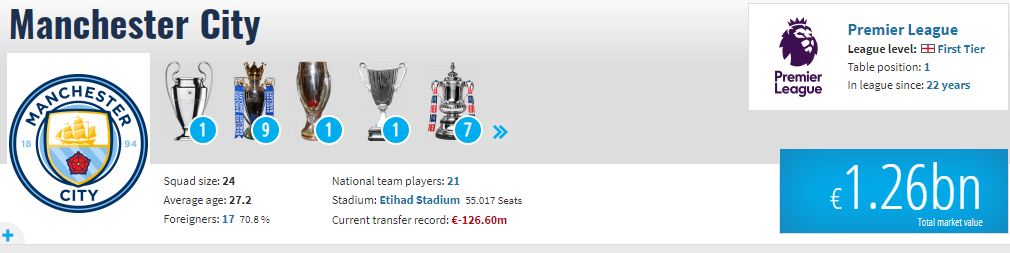 بلغت القيمة التسويقية لفريق مانشستر سيتي مليار و26 مليون يورو، ويعد أغلي اللاعبين تسويقيا