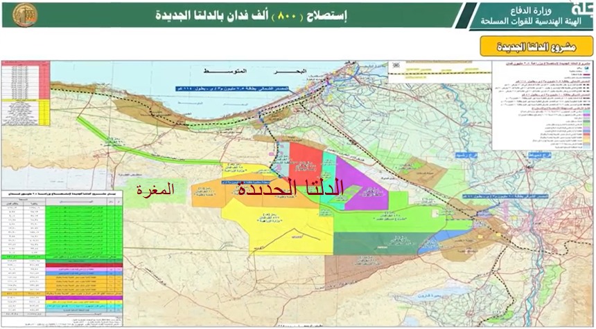واستطرد:" هناك قناة ري جديدة تسمى "النهر الصناعي" تمتد من نهر النيل (فرع رشيد) ومحطة الحمام الجديدة لمعالجة الصرف الزراعى (غرب الإسكندرية ) إلى مشروع الدلتا الجديدة الذي يقع على بعد بضعة كيلومترات من منطقة مشروع المغرة".