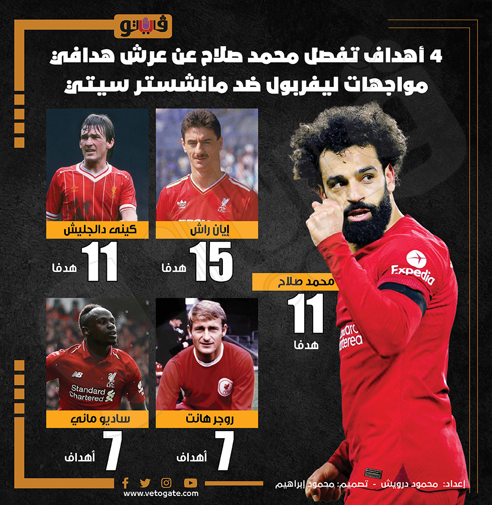 4 أهداف تفصل محمد صلاح عن عرش هدافي مواجهات ليفربول ضد مانشستر سيتي (إنفوجراف)