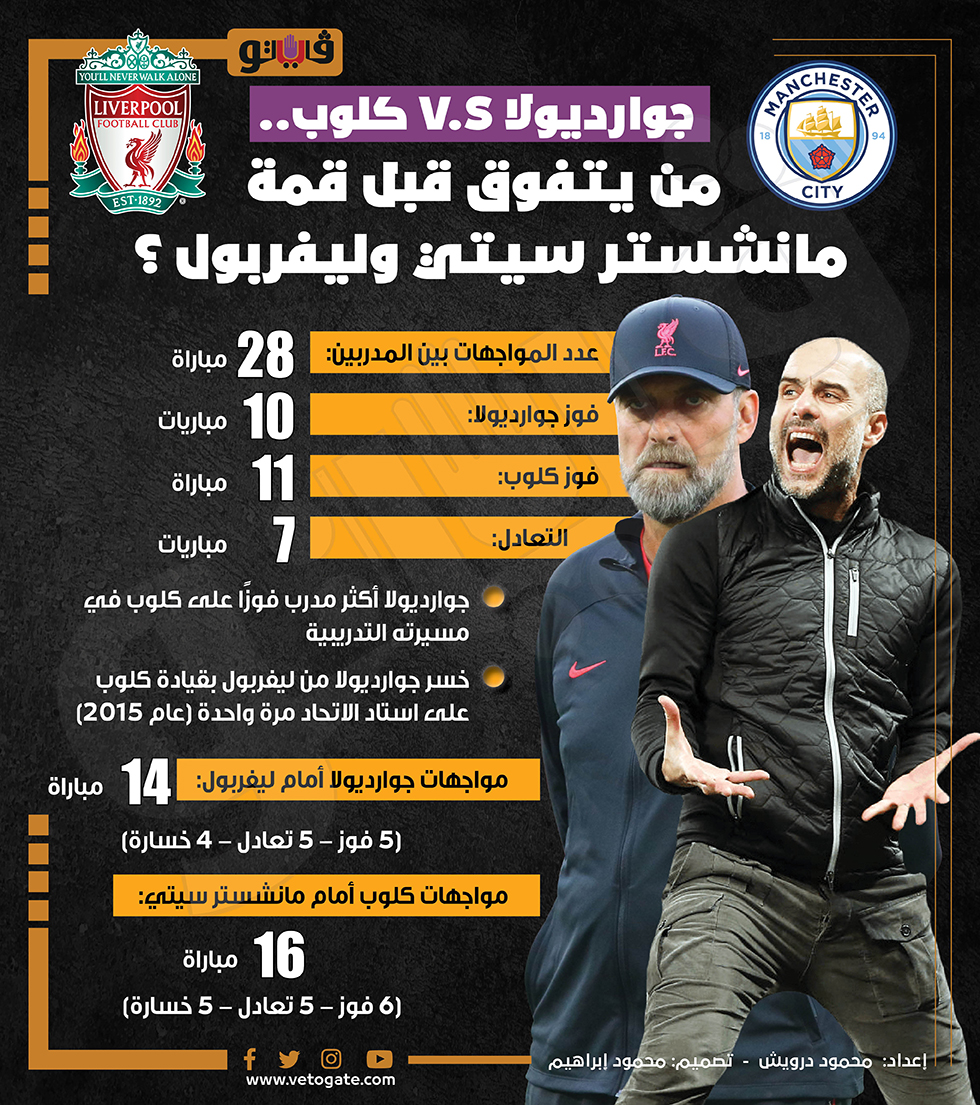 جوارديولا V.S كلوب.. من يتفوق قبل قمة مانشستر سيتي وليفربول ؟ (انفوجراف) السبت 25/نوفمبر/2023 - 12:35 م 11/25/2023 12:35:31 PM جوارديولا ضد كلوب، فيتو محمود درويش شارك طباعة 18 حجم الخط شارك طباعة جوارديولا كلوب مانشستر سيتي ليفربول مانشستر سيتي وليفربول يورجن كلوب