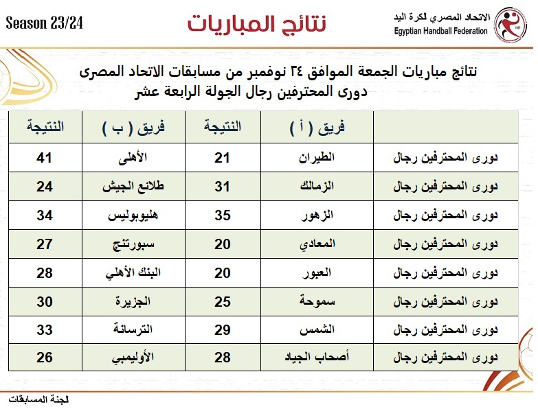 كرة اليد، أقيمت أمس الجمعة، منافسات الجولة الـ14 وقبل الأخيرة من منافسات الدور الأول لدوري المحترفين لكرة اليد بالموسم الحالي 2023/2024.