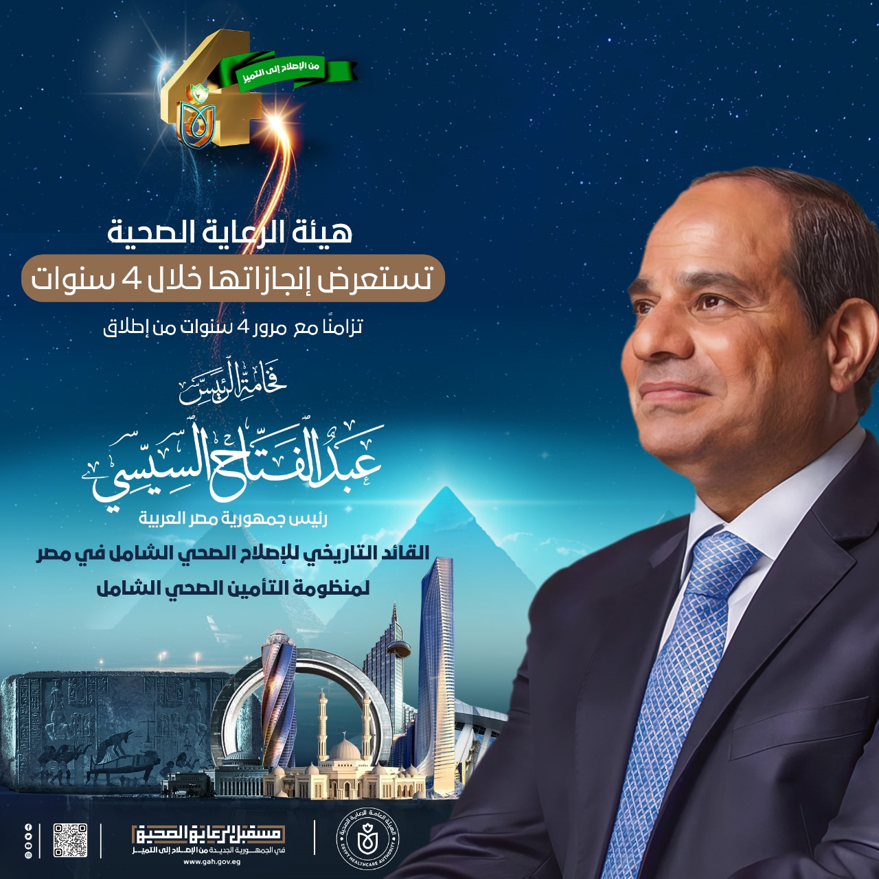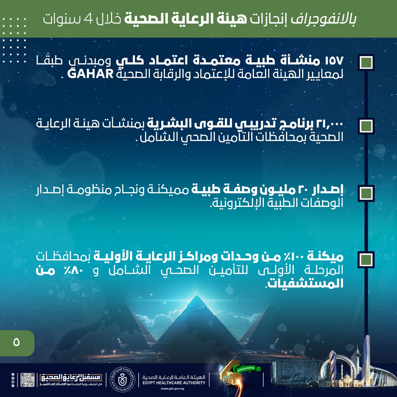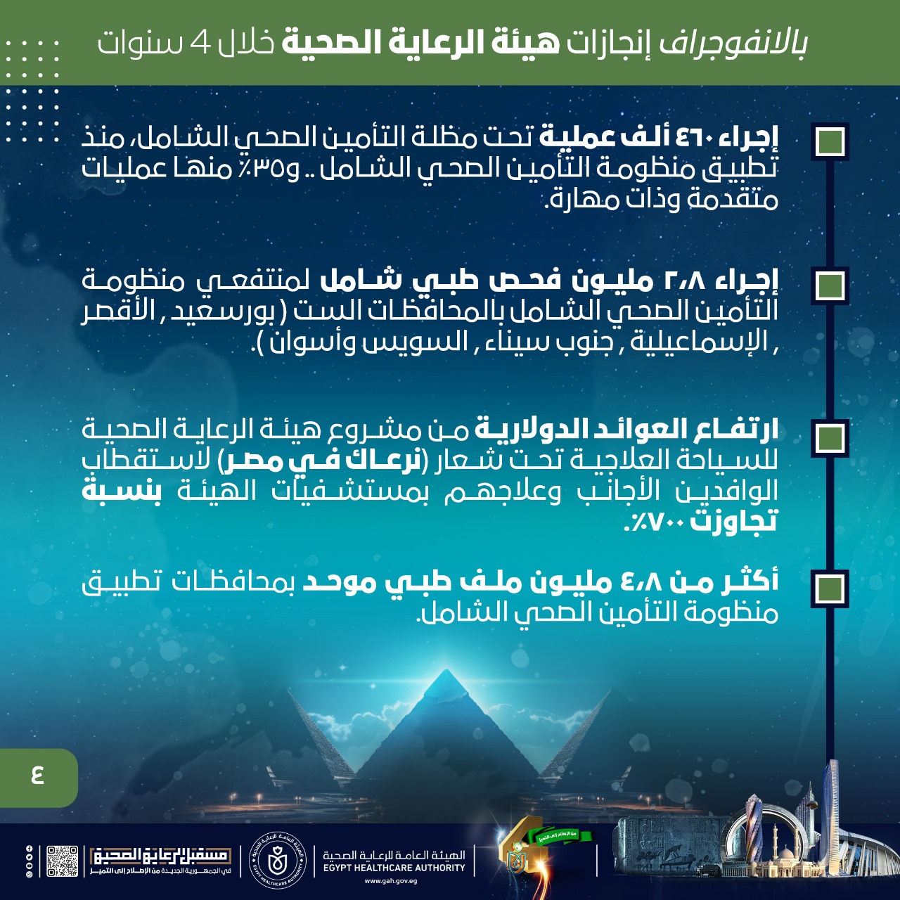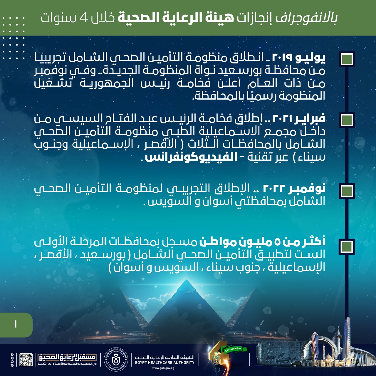 وأبرزت هيئة الرعاية الصحية من خلال (انفوجراف) إنجازاتها خلال 4 سنوات من تطبيق التغطية الصحية الشاملة في مصر، وذلك منذ إطلاق فخامة الرئيس عبد الفتاح السيسي، القائد التاريخي للإصلاح الصحي في مصر، إشارة البدء لانطلاق منظومة التأمين الصحي الشامل تجريبيًا في يوليو 2019 من محافظة بورسعيد، وتشغيلها رسميًا في نوفمبر من نفس العام.