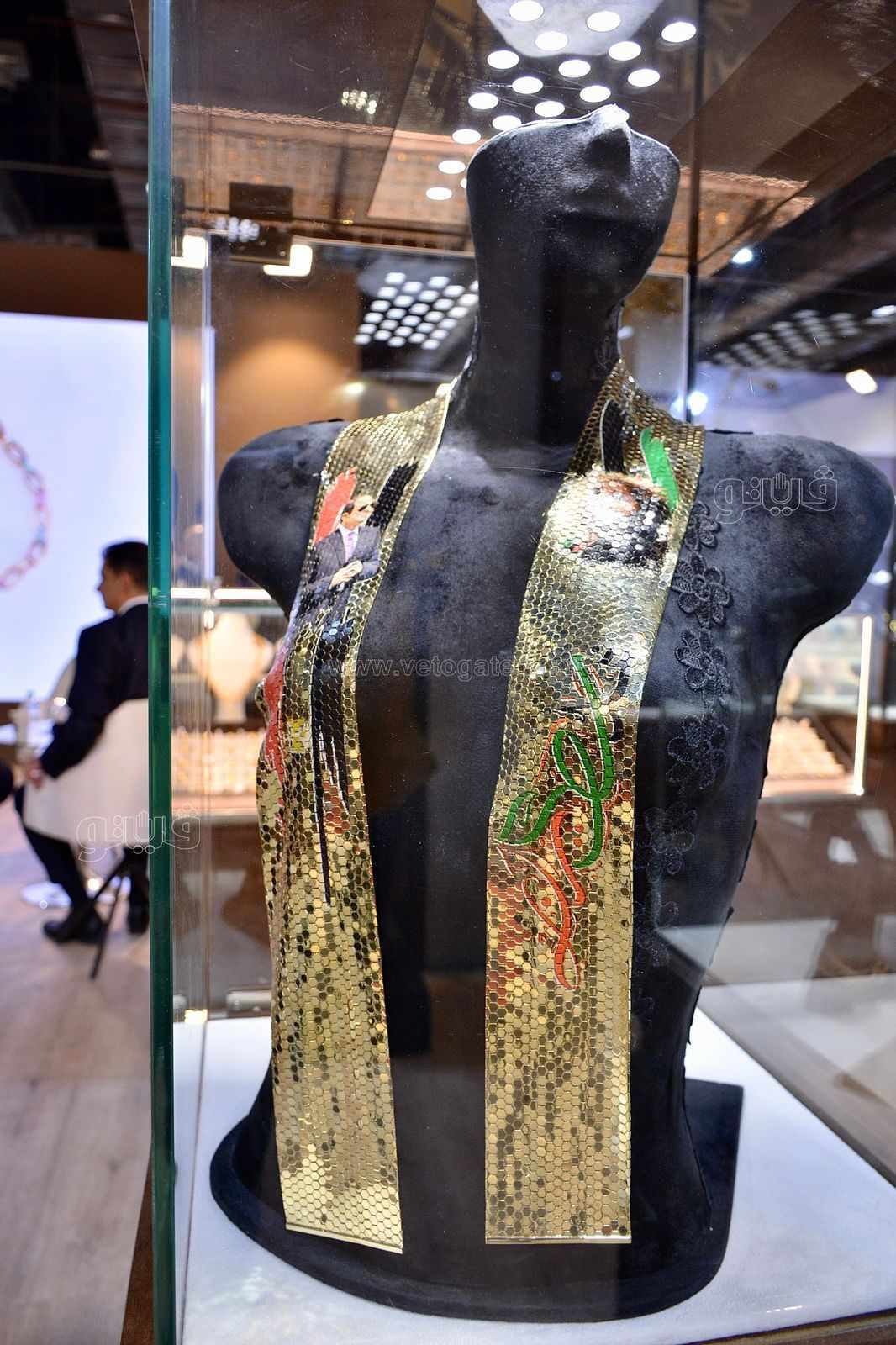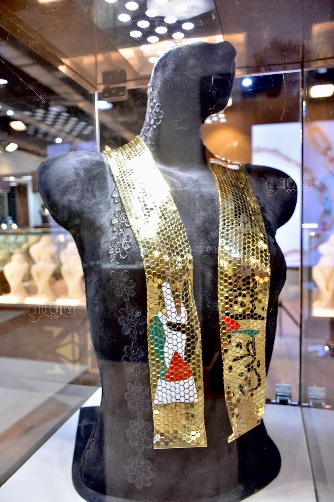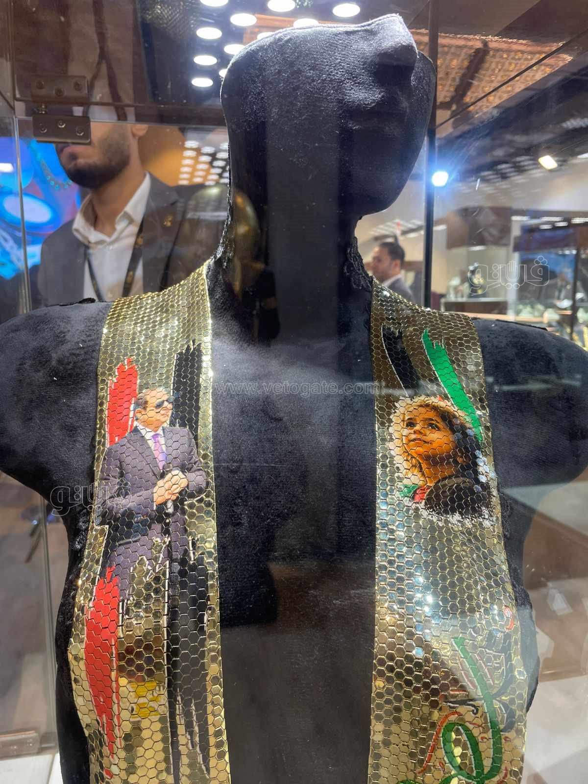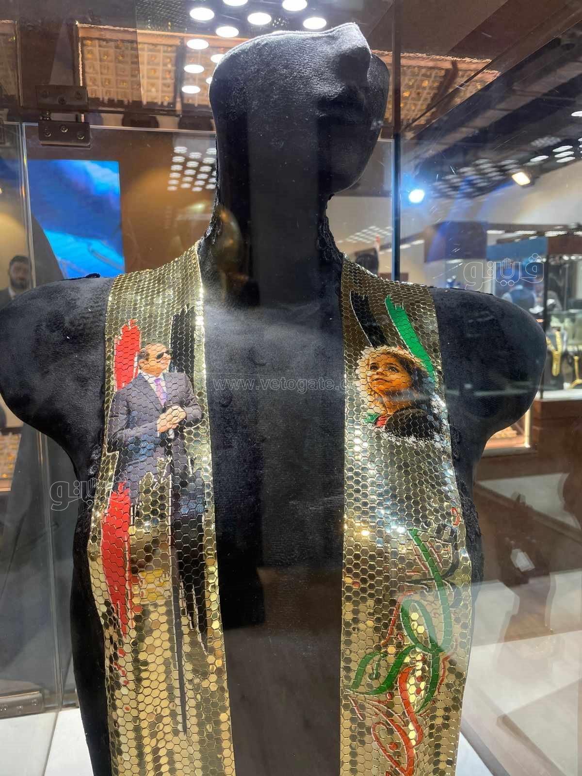 حرص بعض العارضين والمشاركين في معرض الذهب والمجوهرات نيبو في نسخته الثالثة علي تقديم الدعم للقضية الفلسطينية ودعم الموقف المصرى، وحمل الشال الذي يزن وزنه 700جرام وبواقع كيلو إلا ربع صورة الرئيس عبد الفتاح السيسى.