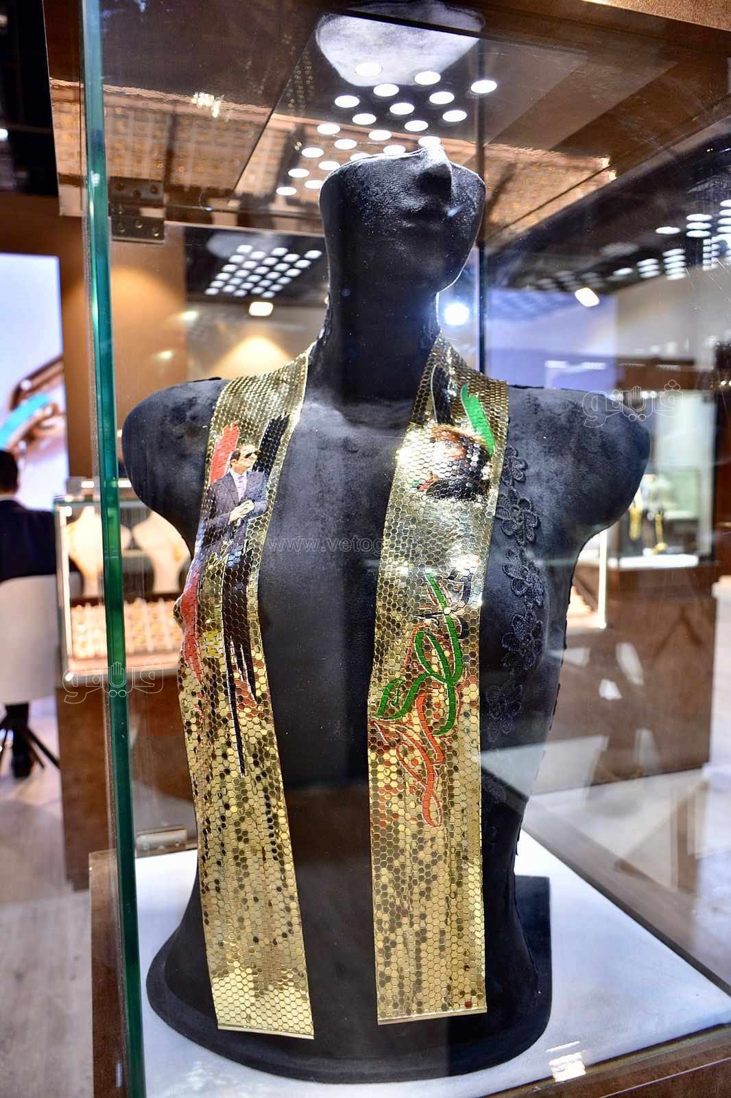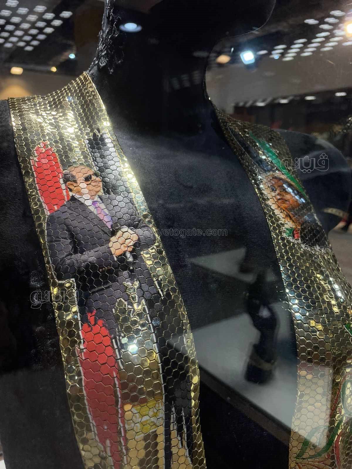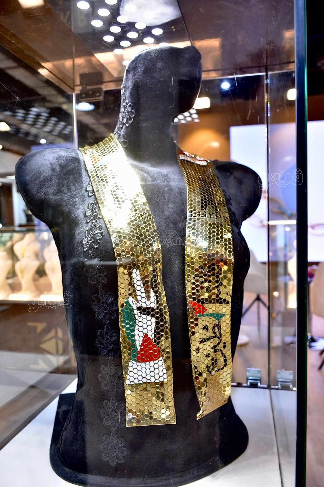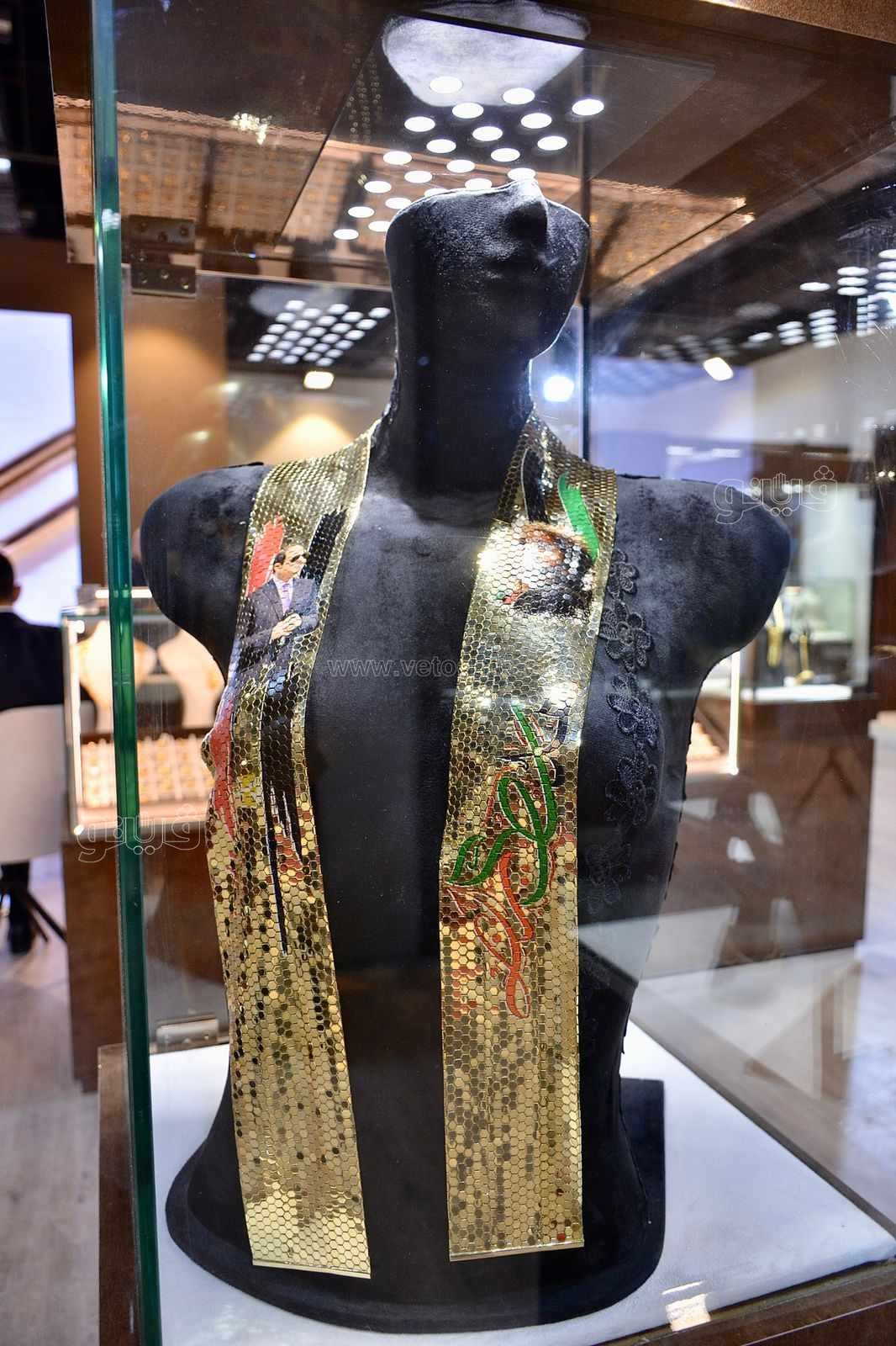 حرص بعض العارضين والمشاركين في معرض الذهب والمجوهرات نيبو في نسخته الثالثة علي تقديم الدعم للقضية الفلسطينية ودعم الموقف المصرى، وحمل الشال الذي يزن وزنه 700جرام وبواقع كيلو إلا ربع صورة الرئيس عبد الفتاح السيسى.