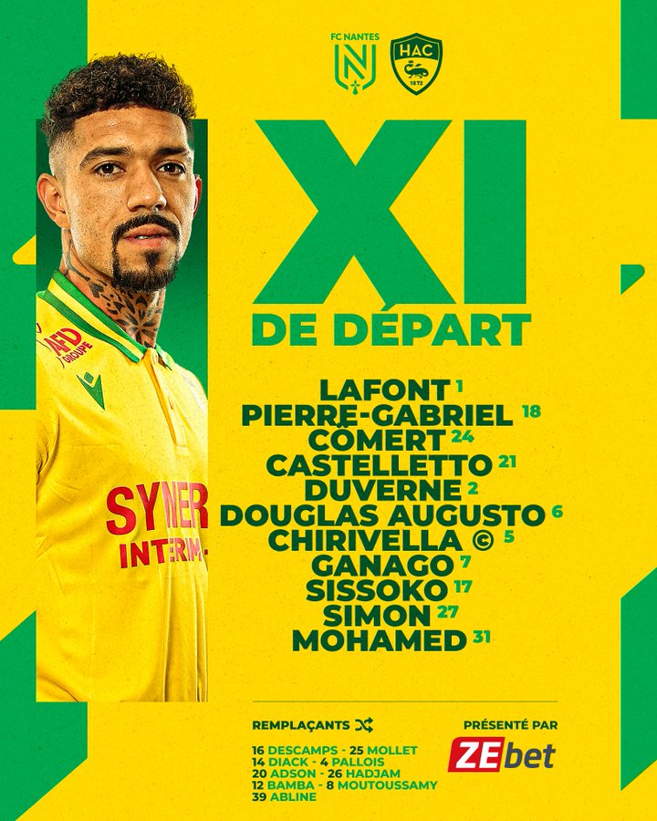 كشف نادي نانت عن تشكيل لاعبيه لمواجهة لوهافر في إطار منافسات الدوري الفرنسي لكرة القدم التي تقام مساء اليوم الأحد.