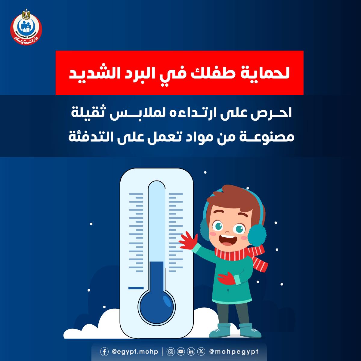 وجهت وزارة الصحة نصائح للأمهات في موسم الشتاء بضرورة الحرض على تدفئة الأطفال من خلال ارتداء ملابس ثقيلة مصنوعة من مواد تعمل على التدفئة خلال فترات البرد الشديد.