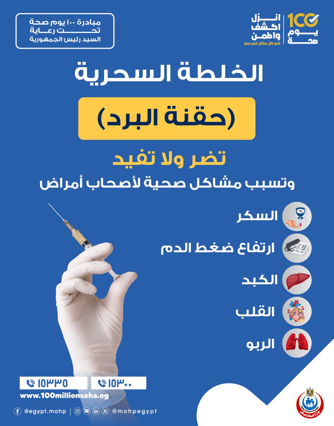 وكشفت وزارة الصحة عن خطورة استخدام حقنة البرد لاصحاب الأمراض المزمنة منهم مرضي السكر والضغط والكبد والربو والقلب.