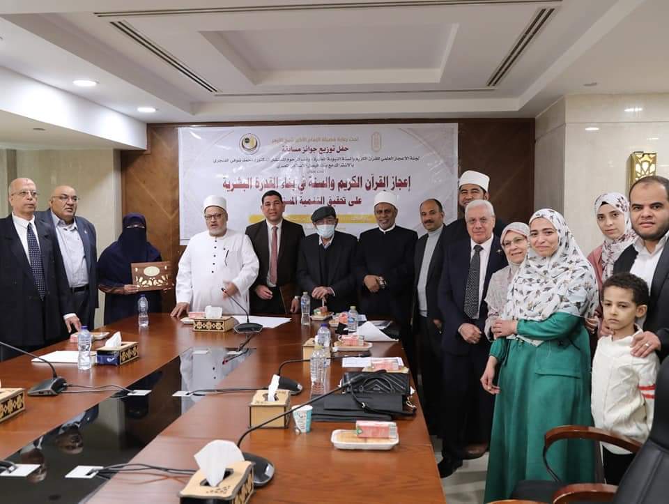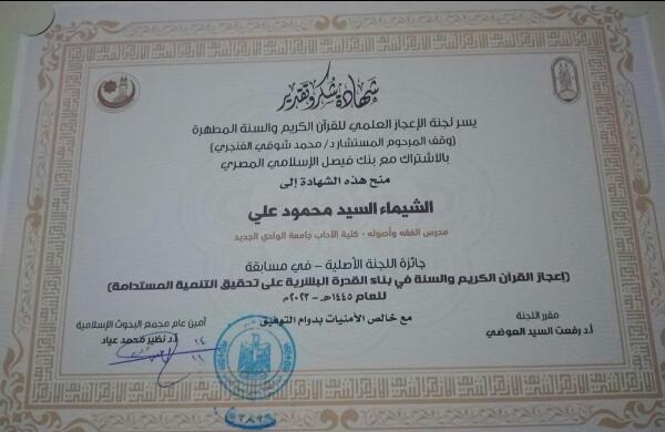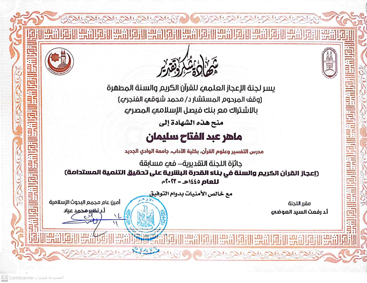 فاز كل من الدكتور ماهر عبد الفتاح سليمان الشامي مدرس التفسير وعلوم القرآن بكلية الآداب بجامعة الوادي الجديد على الجائزة التقديرية لعام 1445 والدكتورة الشيماء السيد محمود علي مدرس الفقه وأصوله بكلية الآداب بجامعة الوادي الجديد على الجائزة الأصلية في موضوع (إعجاز القرآن الكريم والسنة فى بناء القدرة البشرية على تحقيق التنمية المستدامة لعام 2023 م) التي نظمها مجمع البحوث الإسلامية برعاية فضيلة الإمام الأكبر فضيلة الدكتور أحمد الطيب شيخ الأزهر الشريف وذلك، من خلال اللجنة المشكلة بحضور الدكتور سلامة داود رئيس جامعة الأزهر.