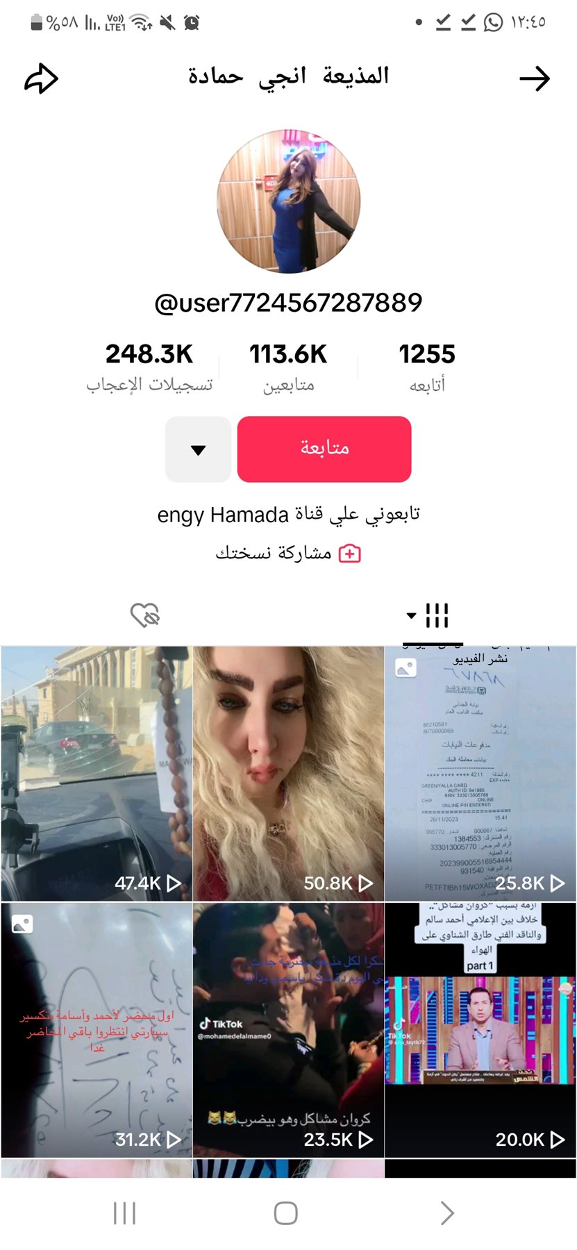 ولاقت قناتها على تيك توك مردودا كبيرا وأخذ يتابعها الكثيرون ويبلغ نسبتهم 113 ألفا وتلقت أكثر من 249 ألف إعجاب على فيديوهاتها التى تتنوع بين الغناء والرقص واستعراضات.