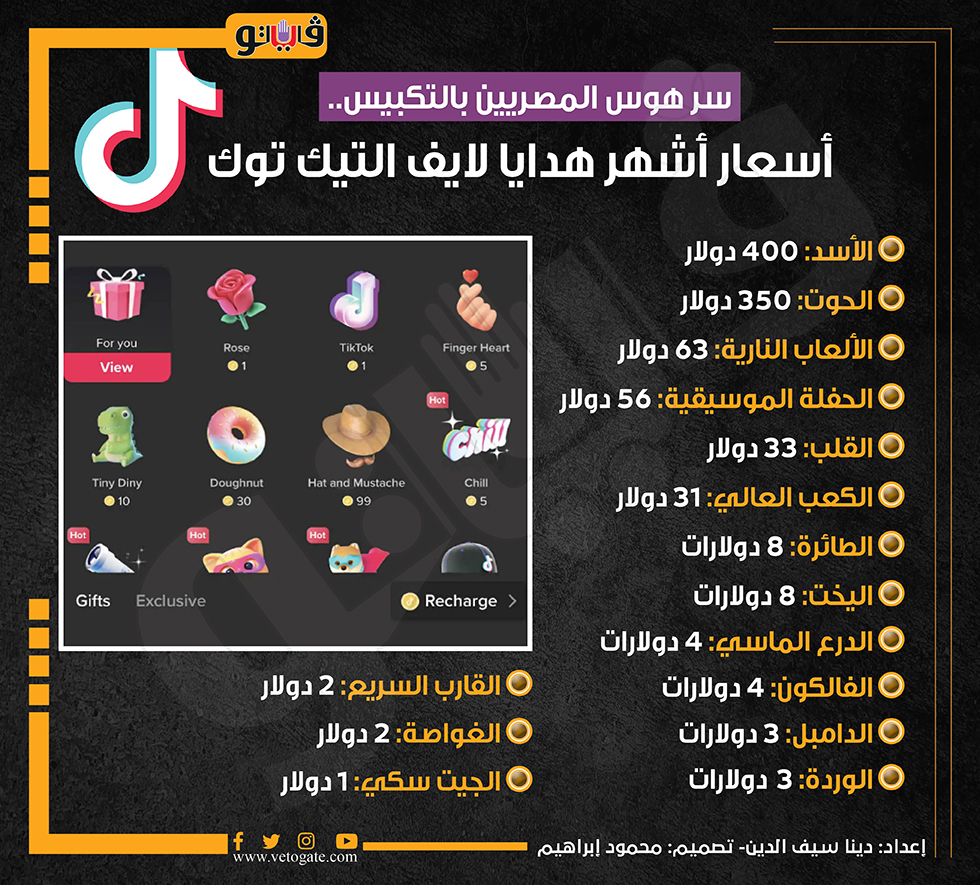 سر هوس المصريين بالتكبيس.. أسعار أشهر هدايا لايف التيك توك (إنفوجراف) الإثنين 27/نوفمبر/2023 - 07:26 م 11/27/2023 7:26:05 PM تيك توك، فيتو دينا سيف الدين شارك طباعة 18 حجم الخط شارك طباعة
