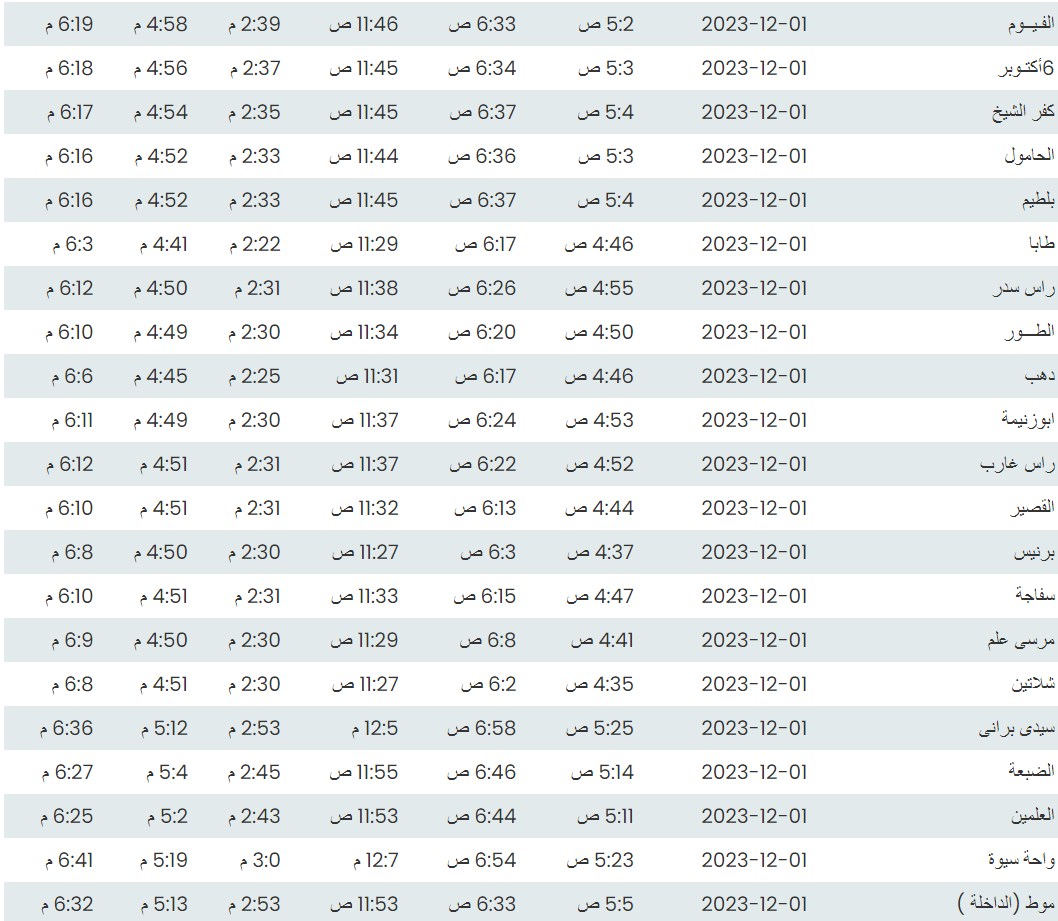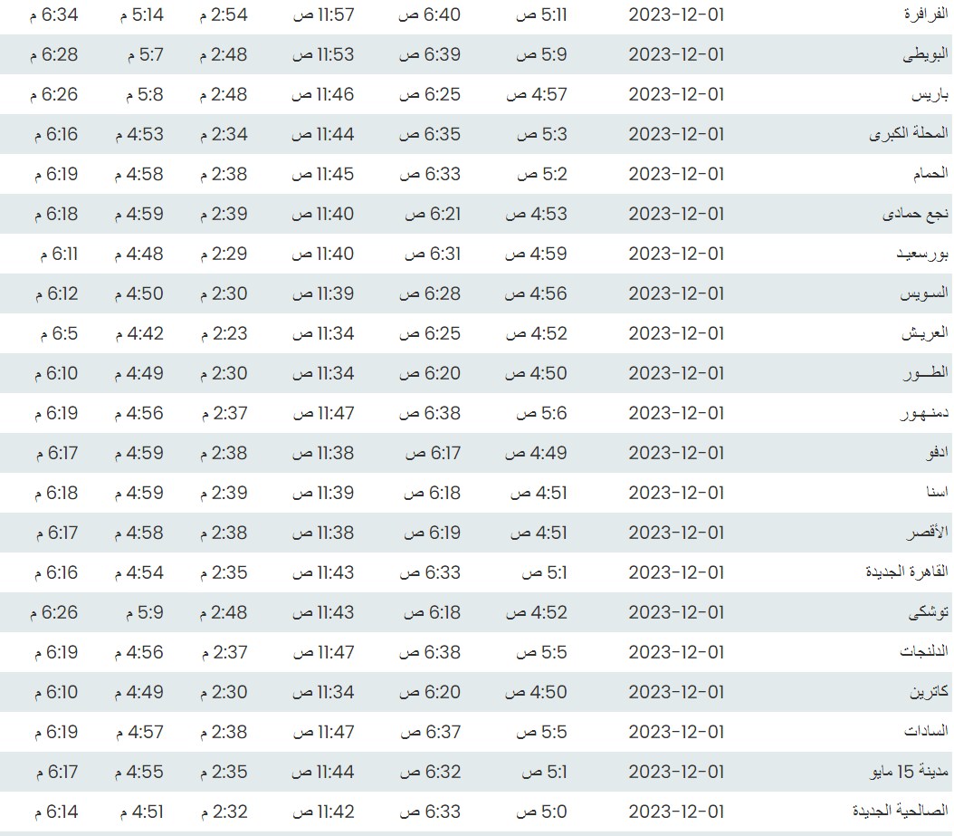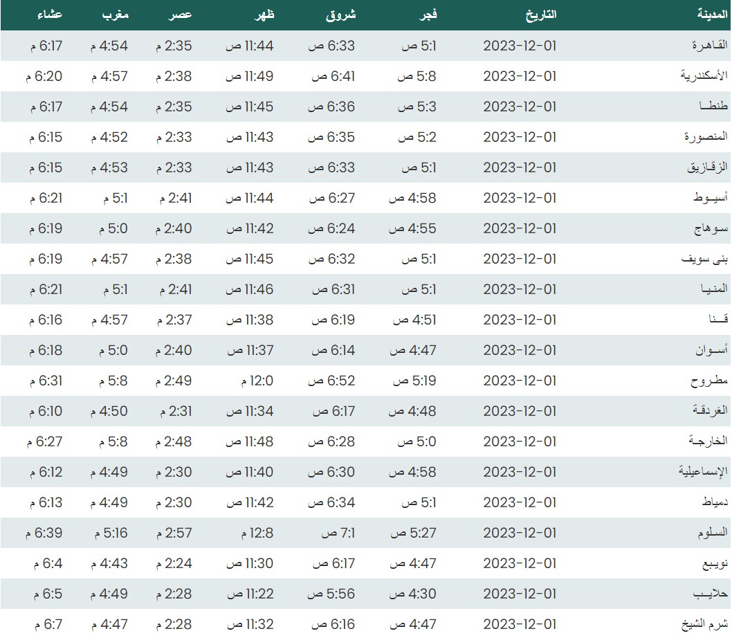 مواقيت الصلاة اليوم وفقًا للتوقيت المحلي لمدينتي القاهرة والإسكندرية وكذلك،مواقيت الصلاة، لعدد من مدن ومحافظات الجمهورية من واقع بيانات الهيئة العامة للمساحة