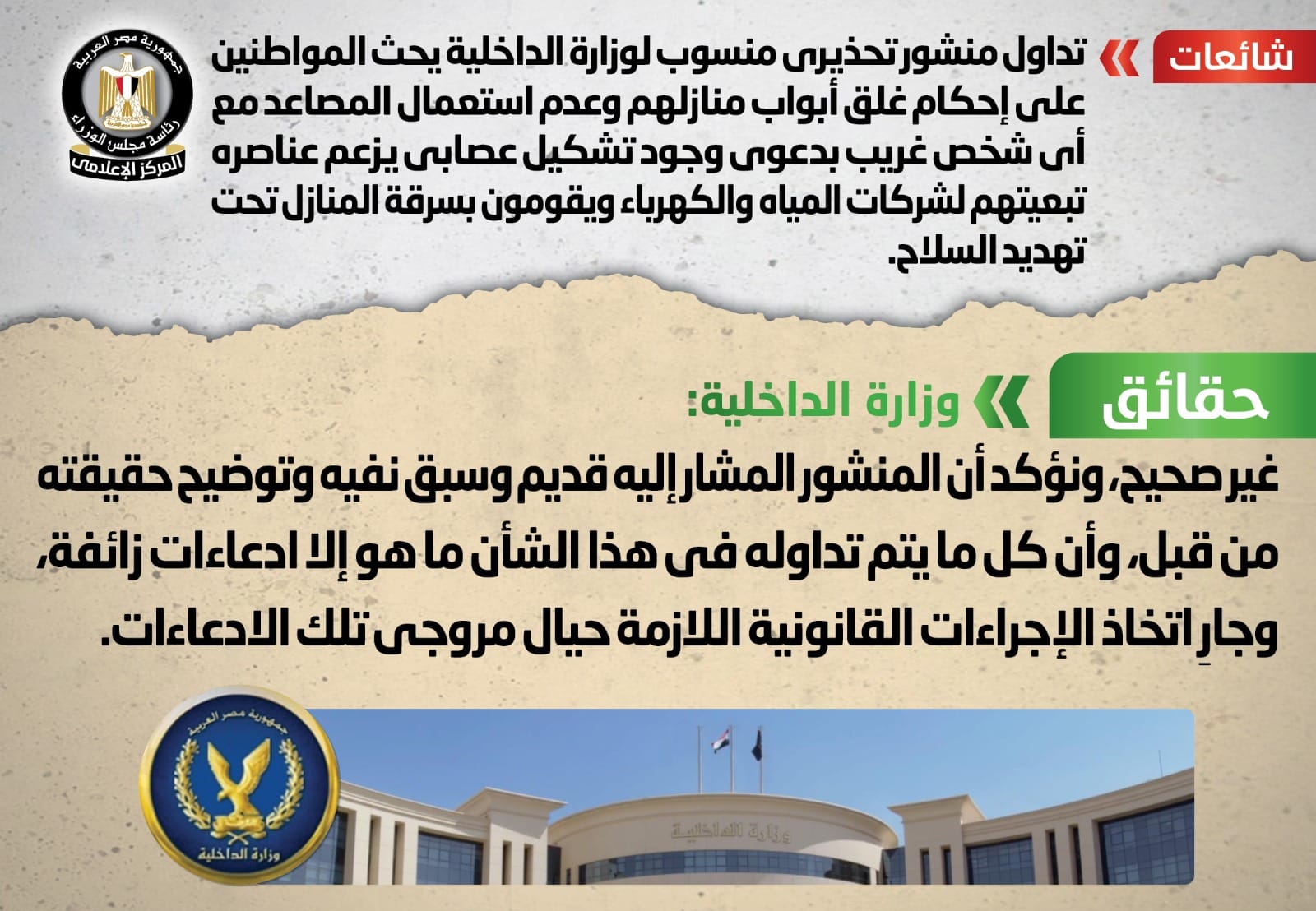 تداول منشور تحذيري منسوب لوزارة الداخلية يحث المواطنين على إحكام غلق أبواب منازلهم وعدم استعمال المصاعد مع أي شخص غريب، بدعوى وجود تشكيل عصابي يزعم عناصره تبعيتهم لشركات المياه والكهرباء ويقومون بسرقة المنازل تحت تهديد السلاح.
