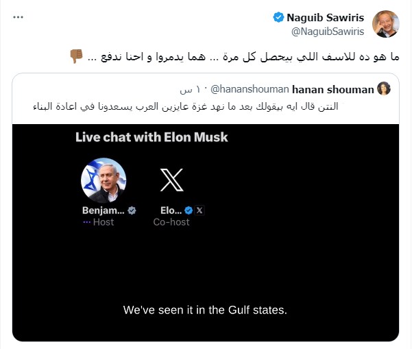 إعادة إعمار غزة، وجه رجل الأعمال، مهندس نجيب ساويرس، رسالة ردًا على ما قاله رئيس وزراء حكومة الاحتلال الإسرائيلي بنيامين نتنياهو، الذي أكد أنه تم تدمير غزة وأنه عرض على العرب المساعدة في إعمار غزة، وذلك في تسجيل صوتي بين نتنياهو والملياردير الأمريكي إيلون ماسك.