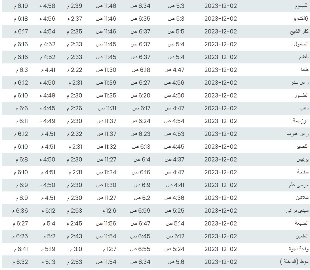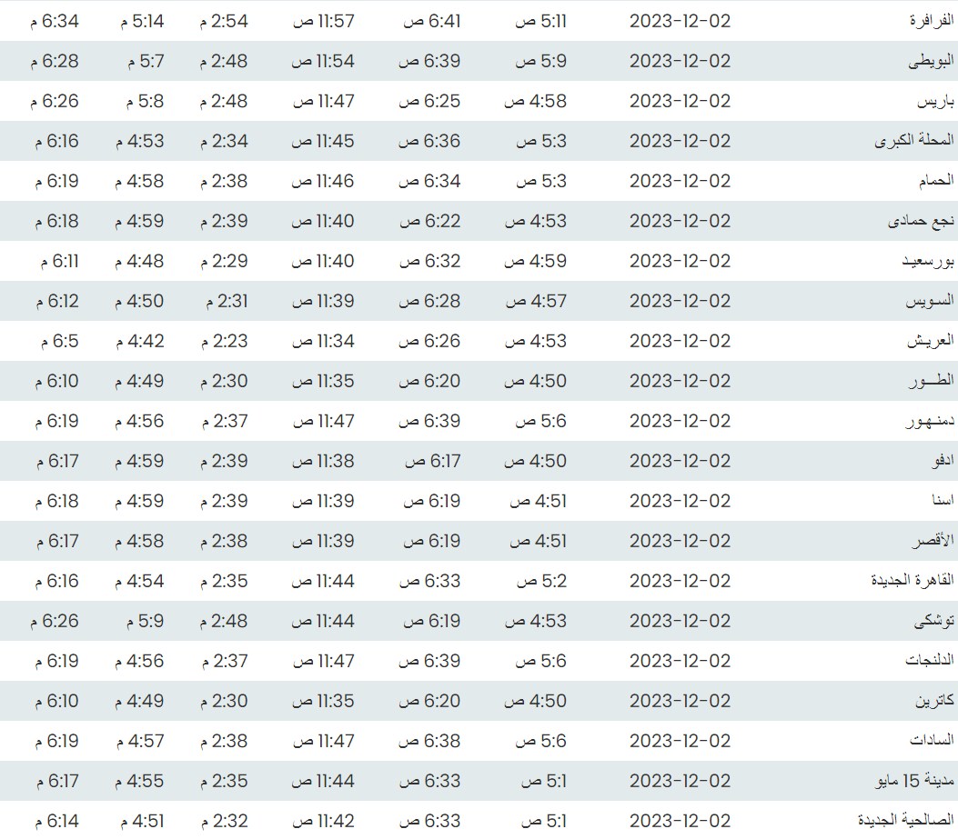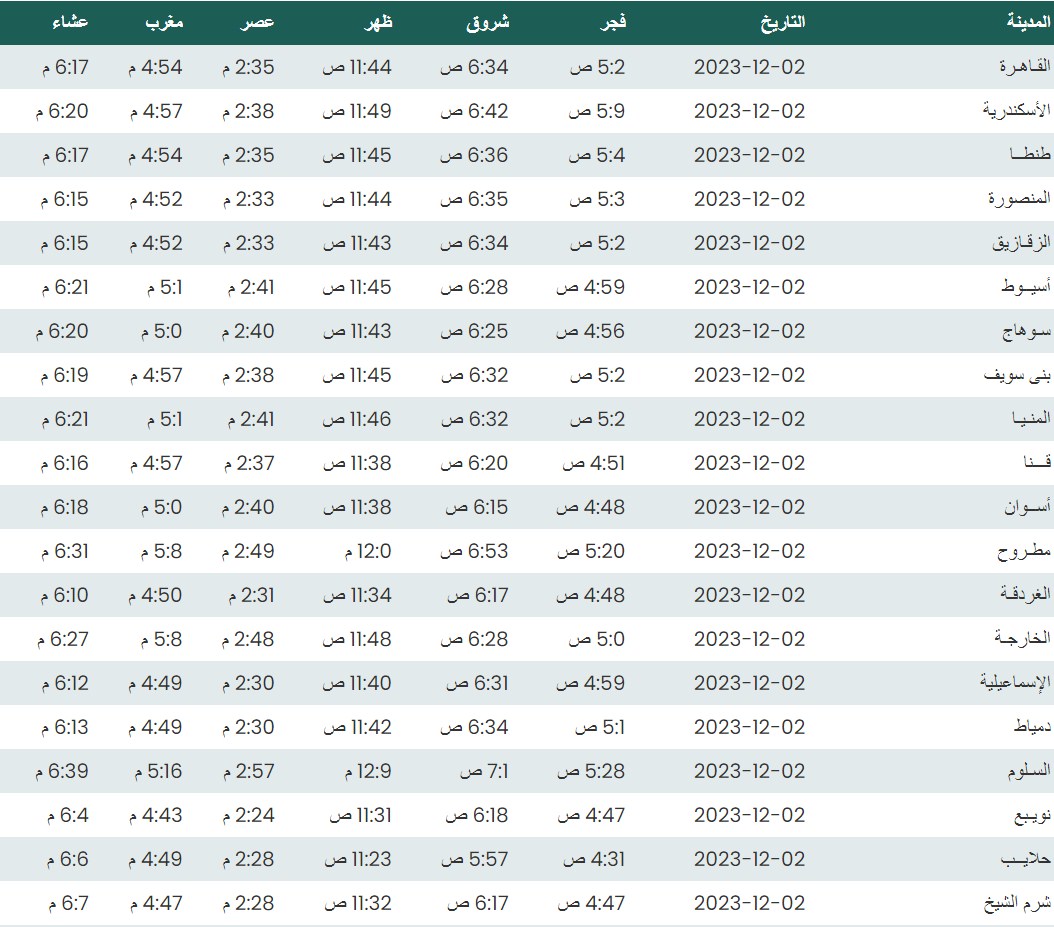 مواقيت الصلاة اليوم وفقًا للتوقيت المحلي لمدينتي القاهرة والإسكندرية وكذلك،مواقيت الصلاة، لعدد من مدن ومحافظات الجمهورية من واقع بيانات الهيئة العامة للمساحة