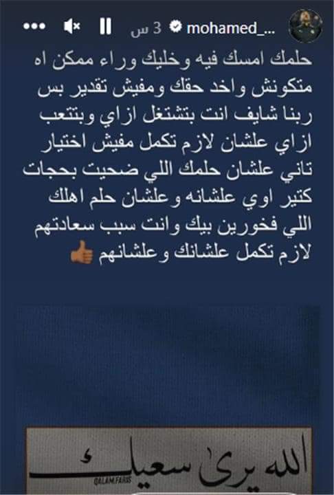 وطلب خالد بيبو من اللاعب عدم التلميح لأي شئ خاص بملف تجديد تعاقده خاصة وأن الأستوري التي قام بنشرها أمس تم تفسيرها بوجود أزمة بينه وإدارة النادي في ملف تمديد عقده خاصة بعد أن أكد اللاعب شعوره بعدم التقدير.