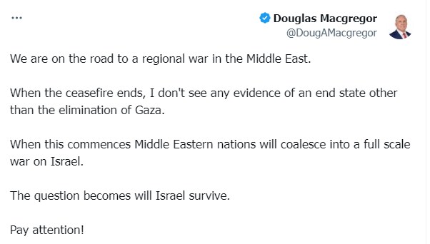 وقال الجنرال الأمريكي دوجلاس ماكجريجور في تحذيره لمنطقة الشرق الأوسط: "نحن على الطريق نحو حرب إقليمية في الشرق الأوسط. عندما ينتهي وقف إطلاق النار، لا أرى أي دليل على حل نهائي غير القضاء على غزة."