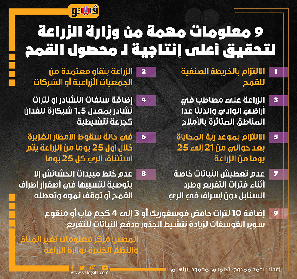 9 معلومات مهمة من وزارة الزراعة لتحقيق أعلى إنتاجية لـ محصول القمح (إنفوجراف) الثلاثاء 28/نوفمبر/2023 - 09:00 م 11/28/2023 9:00:45 PM محصول القمح، فيتو أحمد ممدوح شارك طباعة 18 حجم الخط شارك طباعة وزارة الزراعة محصول القمح انتاج القمح القمح زراعة القمح