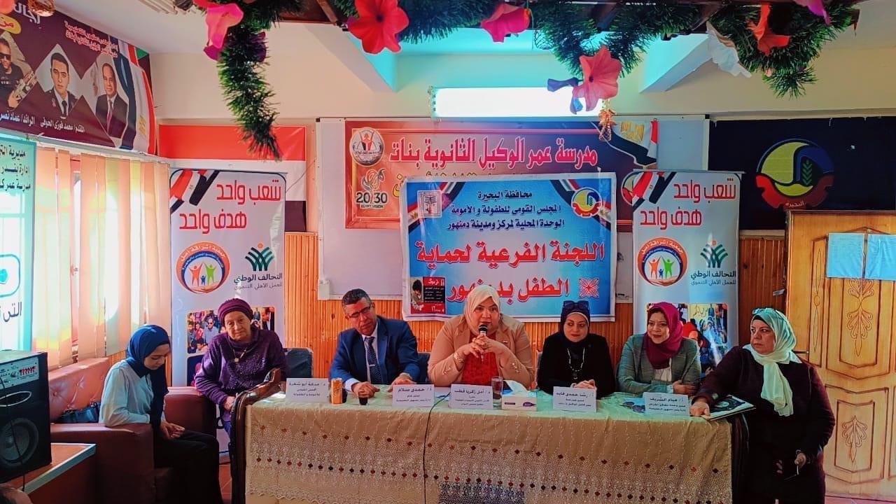 نظمت اللجنة الفرعية لحماية الأطفال بدمنهور برئاسة محمد كجك رئيس مركز ومدينة دمنهور وبالتنسيق مع وحدة تكافؤ الفرص بالإدارة التعليمية ببندر دمنهور ندوة تثقفية بمدرسة عمر الوكيل الثانوية بنات وتناولت شرح واجبات الفتيات بهذة المرحلة والحفاظ على حقوقهن وحقوق وطنهم ومستقبلهم هم وذويهم وتفسير بعض التساؤلات.