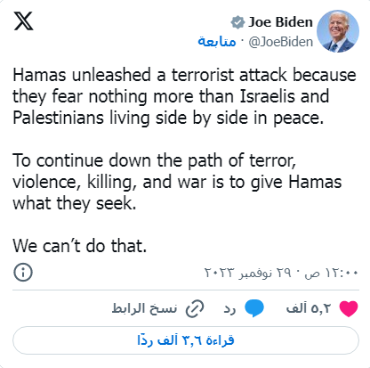 وقال بايدن في منشور على منصة "إكس": "لقد شنت حماس هجومًا مسلحًا لأن أكثر شيء تخشاه هو أن يعيش الإسرائيليون والفلسطينيون جنبًا إلى جنب في سلام".