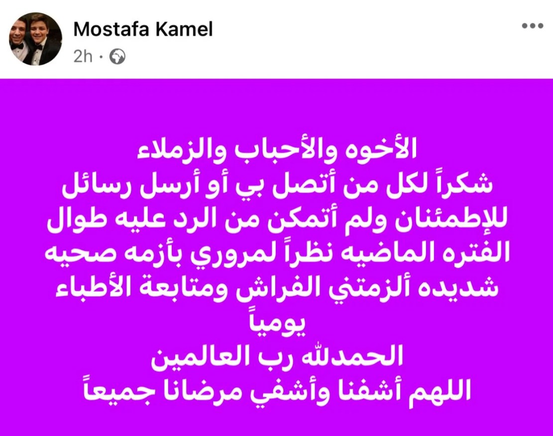 في هذا السياق، كتب مصطفى كامل، في منشور عبر حسابه الشخصي بموقع التواصل الاجتماعي فيس بوك: “الأخوة والأحباب والزملاء.. شكرًا لكل من اتصل بي أو أرسل رسائل للاطمئنان ولم أتمكن من الرد عليه طوال الفترة الماضية نظرًا لمروري بأزمة صحية شديدة ألزمتني الفراش ومتابعة الأطباء يوميًا.. الحمد لله رب العالمين اللهم أشفنا وأشفي مرضانا جميعًا”.