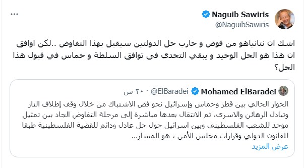 وجاء ذلك ردًا على الدكتور محمد البرادعي المدير العام السابق للوكالة الدولية للطاقة الذرية الذي قال: "الحوار الحالي بين قطر وحماس وإسرائيل نحو فض الاشتباك من خلال وقف إطلاق النار وتبادل الرهائن والاسرى، ثم الانتقال بعدها مباشرة إلى مرحلة التفاوض الجاد بين تمثيل موحد للشعب الفلسطيني وبين اسرائيل حول حل عادل ودائم للقضية الفلسطينية طبقا للقانون الدولي وقرارات مجلس الأمن، هو المسار المنطقي الذى طال انتظاره والذي يجب على العالم كله أن يدعمه بقوة"