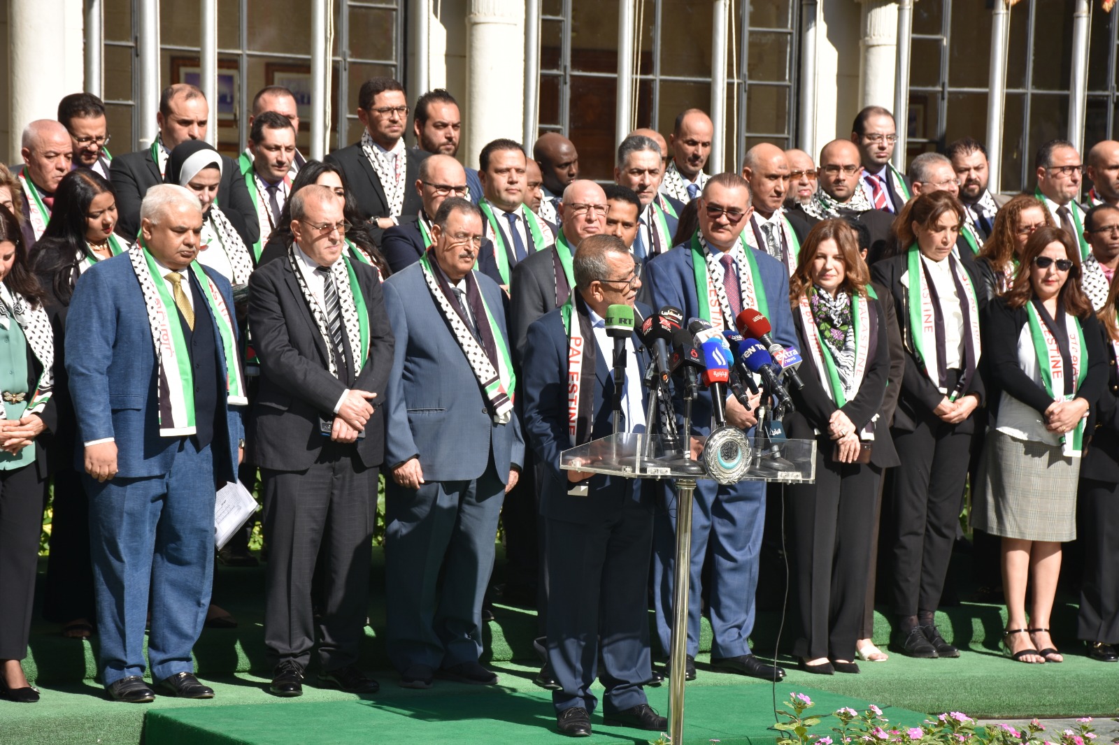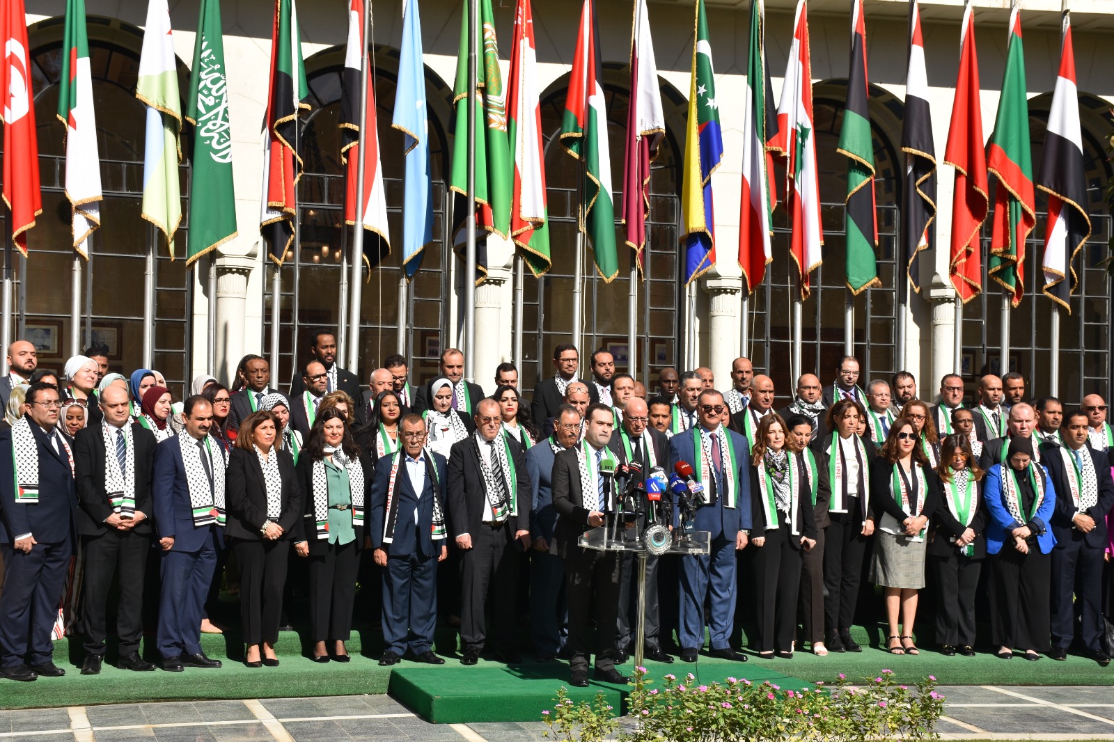 نظمت الأمانة العامة لجامعة الدول العربية اليوم الأربعاء، وقفة تضامنية، بمناسبة اليوم العالمي للتضامن مع الشعب الفلسطيني، والتي بدأت بالنشيد الوطني لدولة فلسطين.