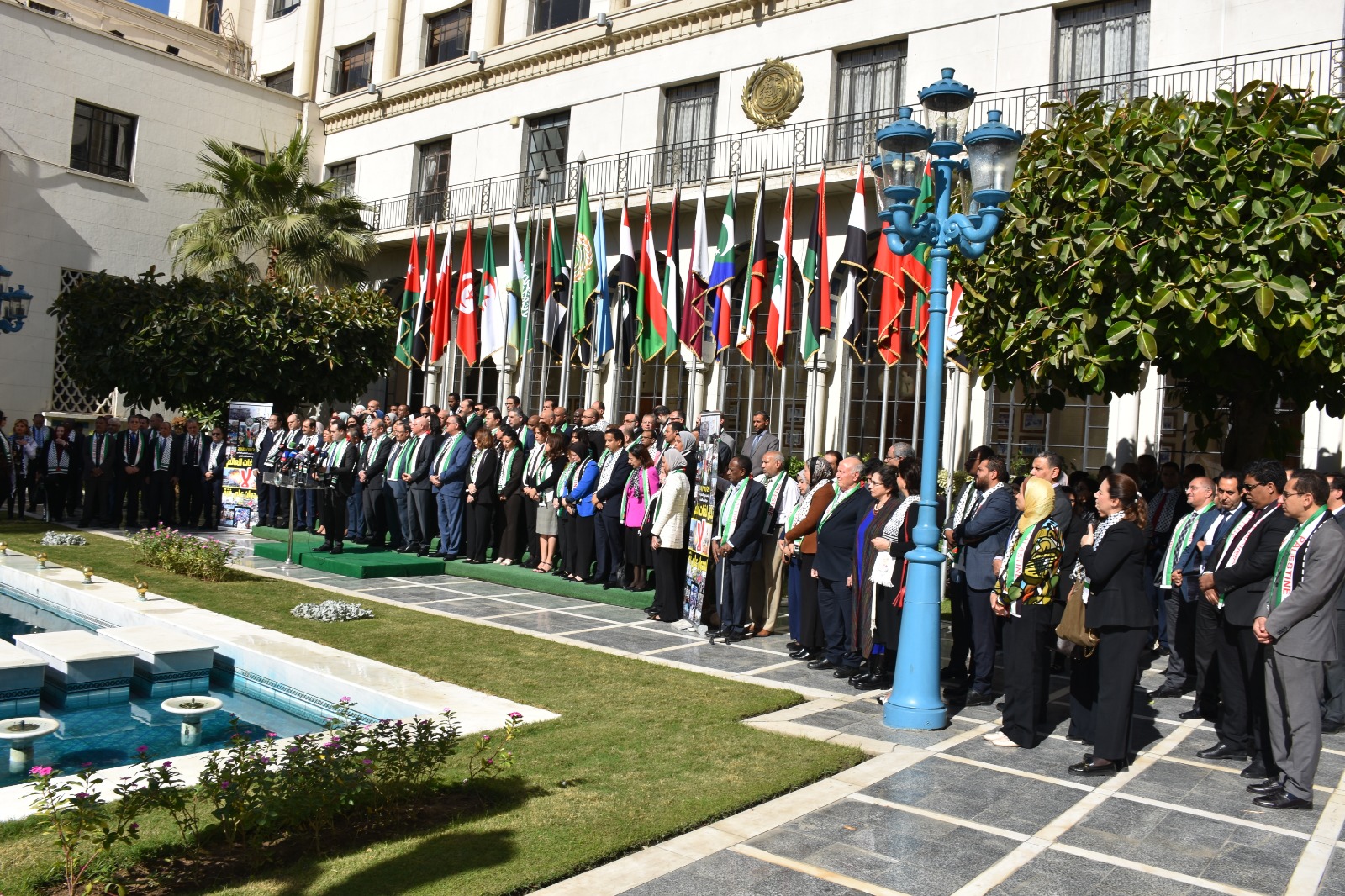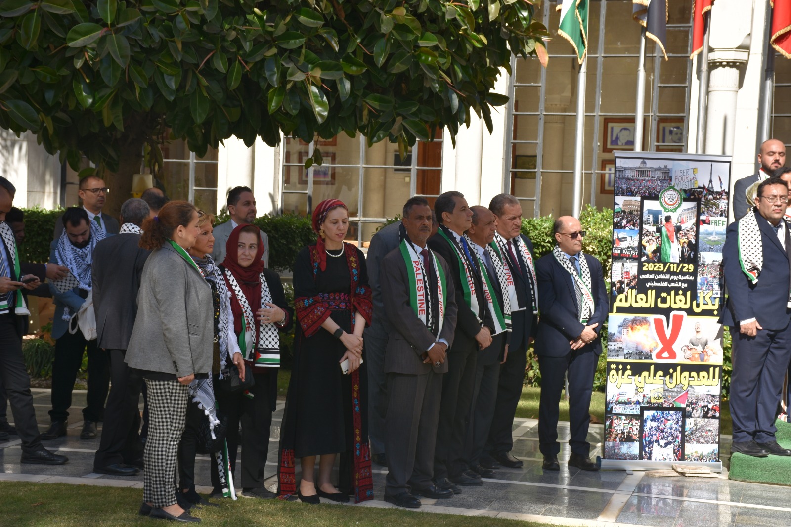 وكانت الأمانة العامة لجامعة الدول العربية نظمت وقفة تضامنية وذلك بمناسبة الاحتفال باليوم العالمي للتضامن مع الشعب الفلسطيني واستهلت الوقفة بالنشيد الوطني الفلسطيني.