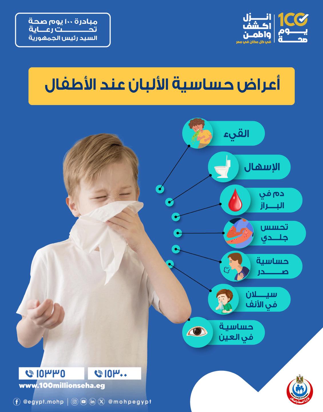 وكشفت وزارة الصحة إن حساسية الألبان تظهر لدى الطفل في فترة التغذية التكميلية حينها يكون الطفل يعانى من حساسية ضد مكونات ألبان الأبقار أو مصاب بمرض من أمراض التمثيل الغذائي.