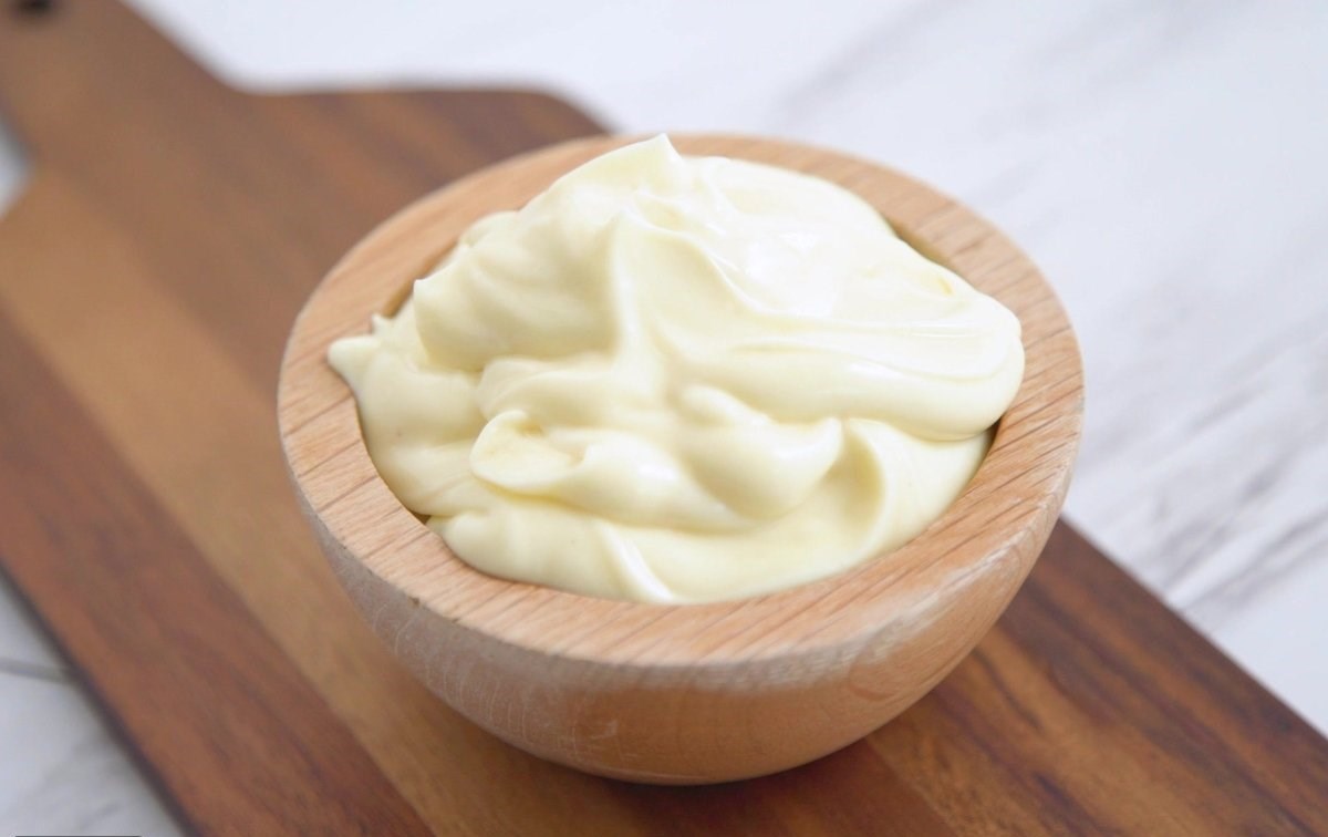 - ثم نضيف الزيت تدريجيا أثناء تشغيل الخلاط الكهربائي حتى نحصل على قوام كريمي متجانس وناعم.