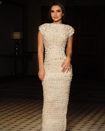 وأطلت كارمن سليمان بفستان أبيض طويل وضيق مع أكمام قصيرة وفتحة من الظهر، يظهر رشاقتها… والفستان من مجموعة زفاف إيلي أبو فيصل لـ2024، وكان بسيطا مزين بالفصوص.