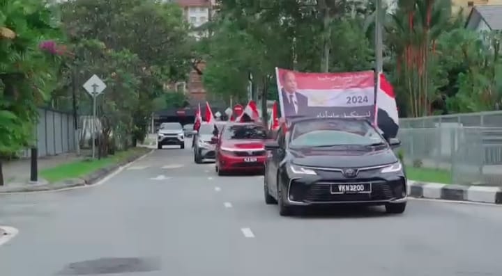 زفة بالسيارات المزينة بالأعلام المصرية أمام مقر لجنة الانتخابات الرئاسية بماليزيا (صور)