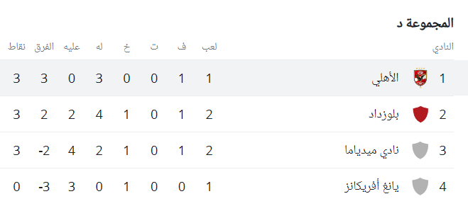 ويتصدر النادي الأهلي المجموعة الرابعة برصيد 3 نقاط، بعد تغلبه في الجولة الأولى على ميدياما الغاني بثلاثية نظيفة فيما يخوض مباراته الثانية أمام يانج أفريكانز غدا السبت، ويأتي شباب بلوزداد في المركز الثاني برصيد 3 نقاط رغم خوضه مباراتين، وفي المركز الثالث فريق ميدياما الغاني برصيد 3 نقاط، حيث خسر مباراته الأولى أمام الأهلي وفاز في المباراة الثانية 2-1 على شباب بلوزداد اليوم الجمعة.
