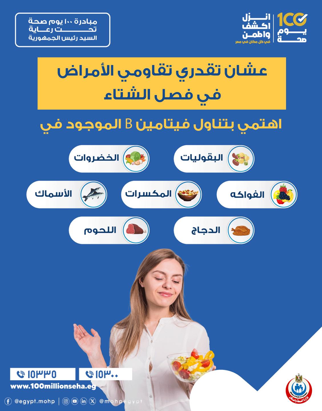 ونصحت وزارة الصحة بضرورة تناول فيتامين B الموجود في عدة مصادر من الأطعمة منها “البقوليات والخضراوات والمكسرات واللحوم والدجاج والفواكه والأسماك”.