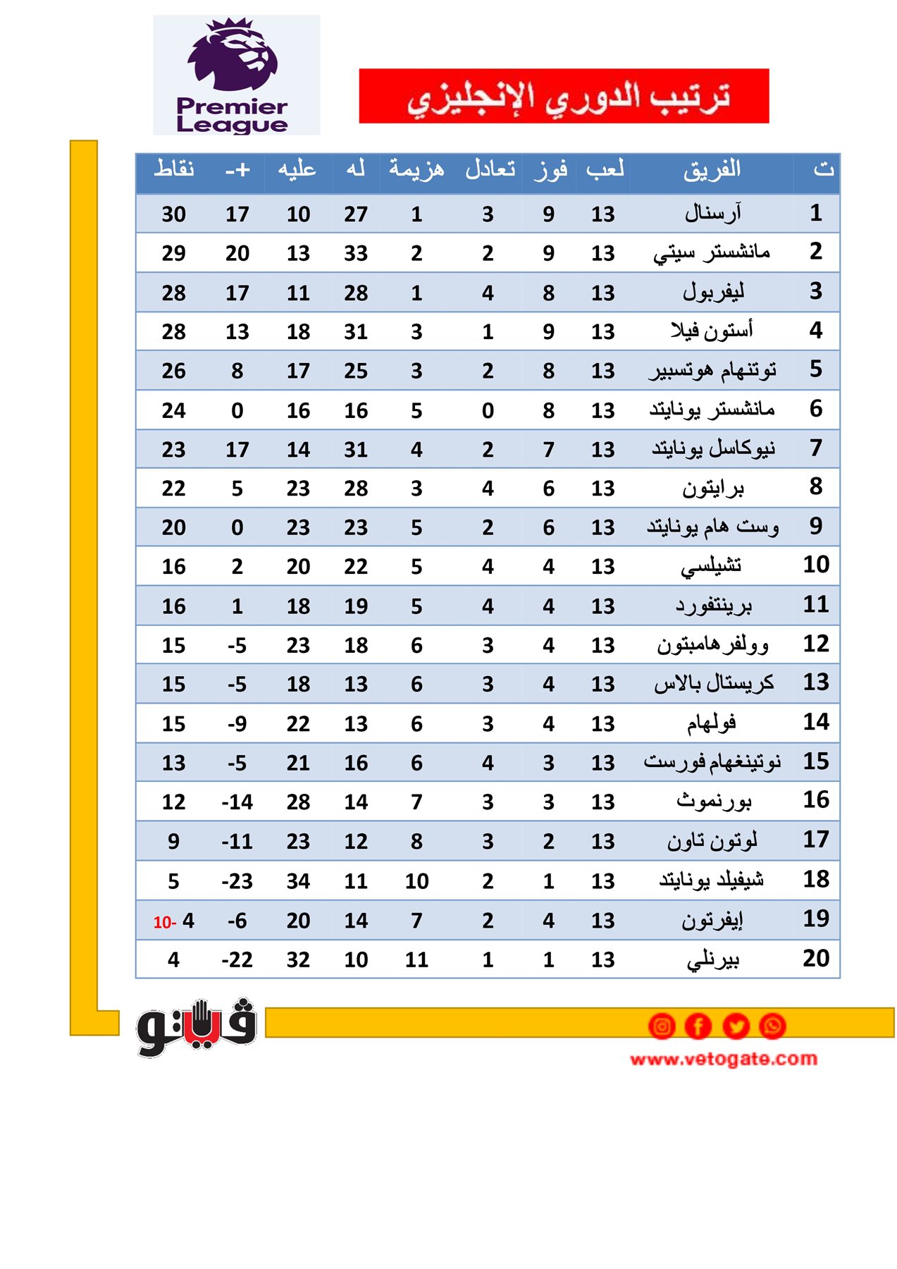 ترتيب الدوري الإنجليزي قبل الجولة الـ 14
