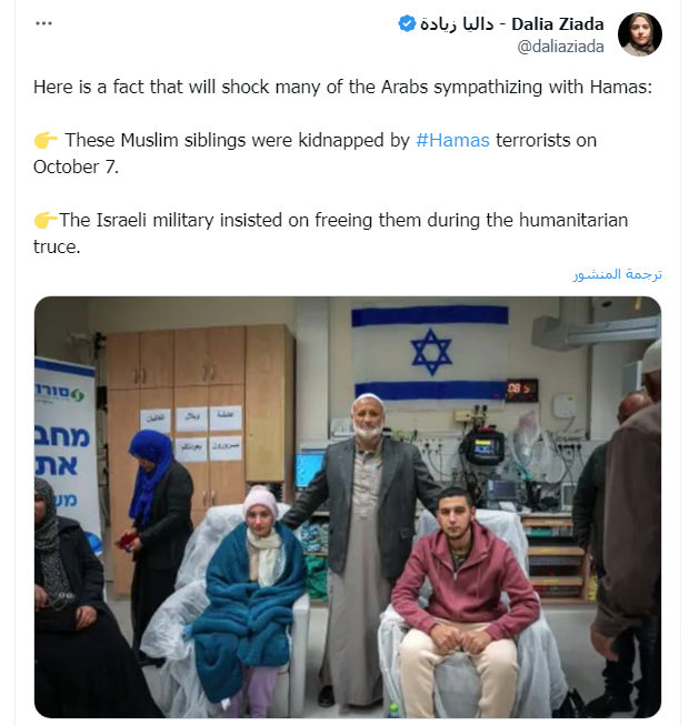 قالت الناشطة الحقوقية داليا زيادة في تغريدتها، التي استفزت بها مشاعر المصريين والعرب: "هذه حقيقة ستصدم الكثير من العرب المتعاطفين مع حماس: تم اختطاف هؤلاء الأشقاء المسلمين من قبل حماس "الإرهابيين" في 7 أكتوبر. وأصرت قوات إسرائيل على إطلاق سراحهم خلال فترة الهدنة الإنسانية."