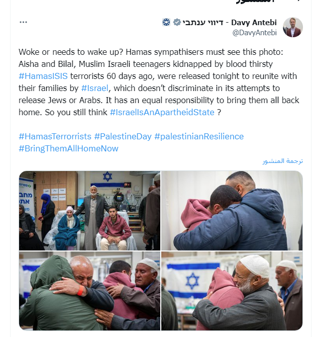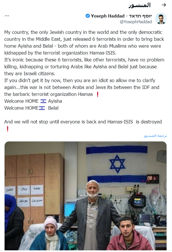 نفس تغريدة داليا زيادة نشرها الصحفي الإسرائيلي يوسف حداد، قبل داليا بساعات، زاعمًا أن إسرائيل الديمقراطية الوحيدة في الشرق الأوسط، وأنها أطلقت سراح ستة إرهابيين من أجل إعادة عائشة وبلال إلى إسرائيل، وهما مواطنين إسرائيليين، مدعيًا أن الحرب الإسرائيلية الغاشمة على حركة المقاومة حماس، وليست بين العرب، وذلك يتناقض مع ما تقوم به إسرائيل من جرائم إبادة جماعية ضد المدنيين والأطفال في قطاع غزة.