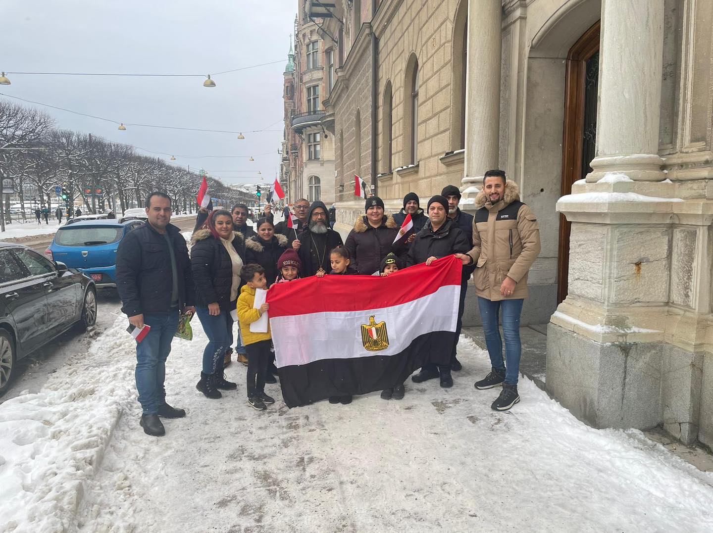 وظهر أبناء الجالية المصرية فى السويد وتحيطهم الثلوج أمام السفارة قبل التصويت، رافعين الأعلام المصرية.