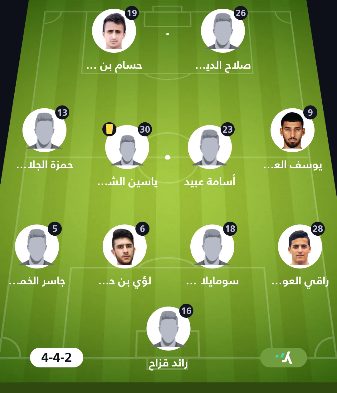 خط الوسط: سوف العيدوني، أسامة عبيد، ياسين الشماخ، حمزة الجلاصي.