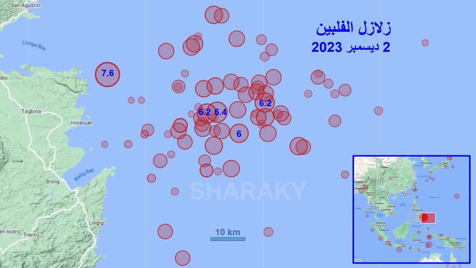 ومن جانب آخر، كشف الدكتور عباس شراقي أستاذ الجيولوجيا والموارد المائية بجامعة القاهرة، أن العاصفة الزلزالية التي ضربت جنوب الفلبين تصل إلى 7.6 درجة بمقياس ريختر بالقرب من الساحل الجنوبي للفلبين، على عمق حوالي 32 كم، تبعه عشرات الزلازل بقوة تتراوح بين 3 – 6.4 درجة منها 4 زلازل قوية 6.4، 6.2، 6.1، 6.0 مما دفع العديد من السكان إلى الفرار من منازلهم في حالة من الذعر خوفا من حدوث تسونامي.
