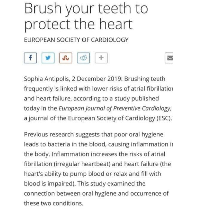 الجدير بالذكر أن دراسة طبية عن الأسنان ومرض القلب، توصلت إلى أن غسل الأسنان ثلاث مرات فأكثر يوميًا، قد يقلل من خطر الإصابة بأزمة قلبية بنسبة أكبر من 10%، كاشفة عن دور غسل الأسنان في الحد من البكتيريا الموجودة بين الفم واللثة.
