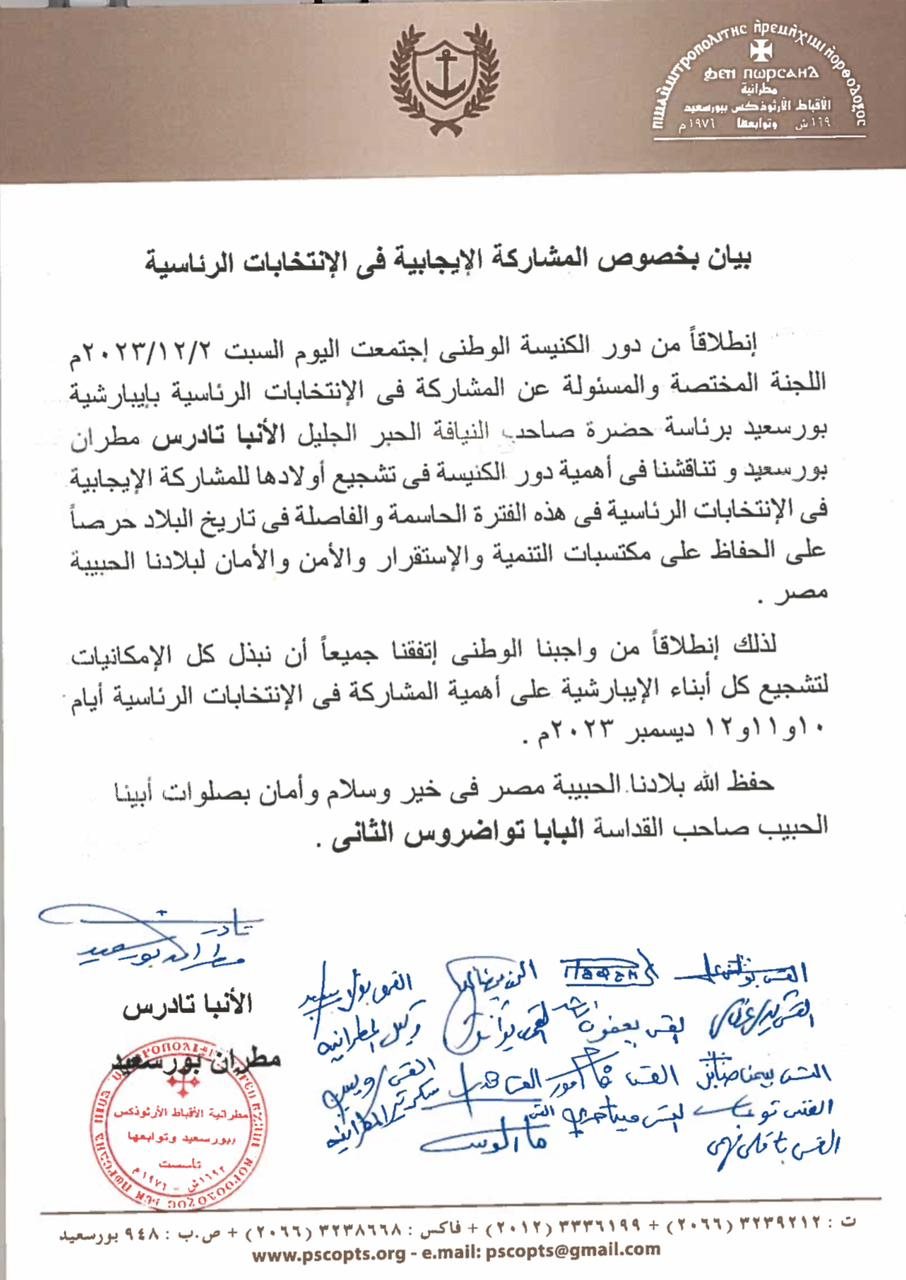 كما أكدت مطرانية الأقباط الأرثوذكس ببورسعيد خلال البيان أيضًا أن إيبارشية بورسعيد تبذل كل الإمكانات لتشجيع المشاركة في الإنتخابات الرئاسية ايام 10 و11 و12 ديسمبر القادمين.