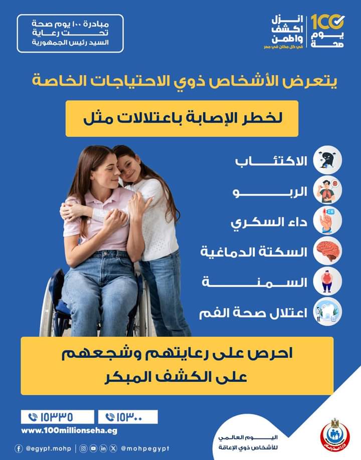 وأوضحت وزارة الصحة أن الأشخاص ذوي الإعاقة يتعرضون لعدد من الأمراض منها: