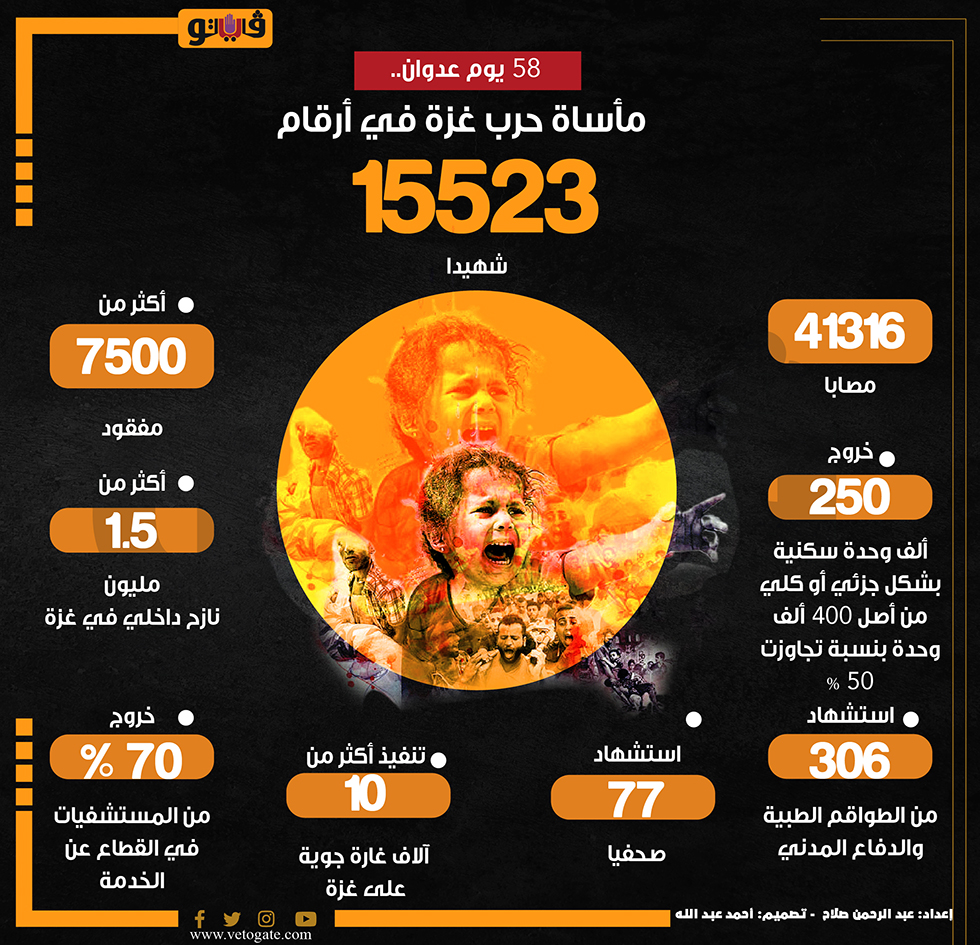 58 يوم عدوان.. مأساة حرب غزة في أرقام (انفوجراف) الإثنين 04/ديسمبر/2023 - 02:00 م 12/4/2023 2:00:43 PM غزة، فيتو عبدالرحمن صلاح شارك طباعة 18 حجم الخط شارك طباعة طوفان الأقصى جيش الاحتلال فلسطين غزة اخبار غزة غزة الان العدوان على غزة