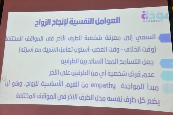 وأضافت القباج أن اهتمام القيادة السياسية جاء حرصًا واهتمامًا وحمايةً لكيان الأسرة المصرية التي تُمثّل نواة المجتمع والحضّانة الأولى لبناء إنسان سوي، ومواطن ناجح قادر على المُشاركة الفعالة داخل مجتمعه، مشيرة إلى أن مشروع مودة هو مشروع طموح استطاع أن يحقق وثبات عالية، فخطواته الأولى بدأت بتنفيذ أربع مُبادرات على مستوى خمس محافظات، ولكن اليوم، يُنفذ مشروع مودة 14 مُبادرة مختلفة من خلال 4 حقائب تدريبية متخصصة، وتمكَّن من أن يصل بتدريباته المُباشرة حتى يومنا هذا إلى 492,931 شاب وفتاة على مستوى جميع محافظات مصر داخل مختلف المراكز والقرى والنجوع رغم تحدي جائحة كورونا وتوقف الأنشطة المباشرة لما يقرب من عام كامل، كما وصل عدد المستفيدين من منصة مودة الرقمية للتعلُّم عن بُعد إلى ما يقرب من 4,7 مليون مواطن مصري، هذه المنصة التي تم اعتمادها من قِبَل المجلس الأعلى للجامعات كأحد متطلبات التخرج الاختيارية، ونأمل أن تصبح متطلب إلزامي في القريب العاجل ليستفيد منها جميع طلبة وطالبات الجامعات المصرية.
