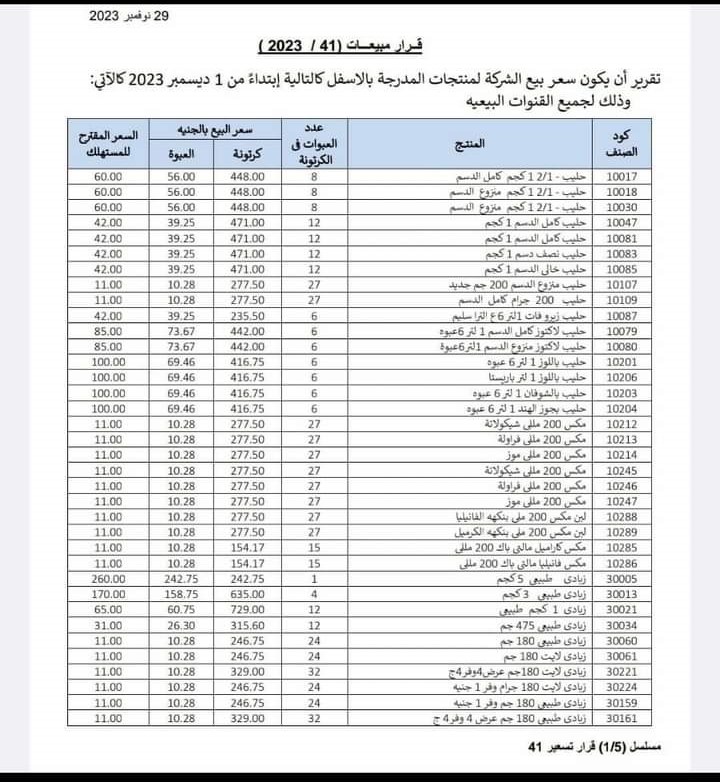 وعن قائمة أسعار منتجات الشركة الاستثمارية لمنتجات الألبان بعد تطبيق الزيادة في 2 ديسمبر الجاري، فجاءت كالتالي: