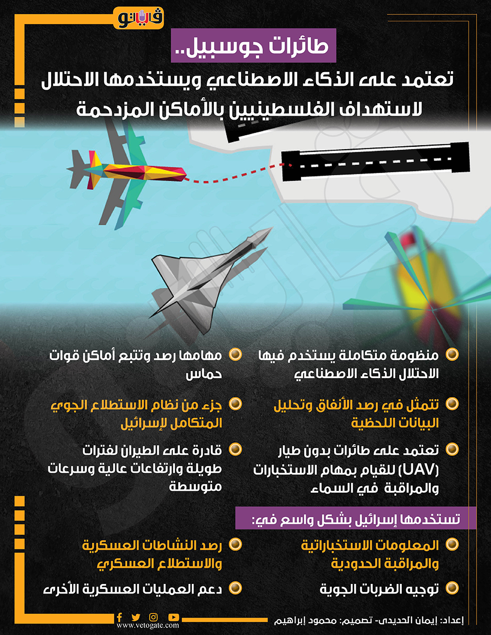 طائرات جوسبيل.. تعتمد على الذكاء الاصطناعي ويستخدمها الاحتلال لاستهداف الفلسطينيين بالأماكن المزدحمة (إنفوجراف) الإثنين 04/ديسمبر/2023 - 06:46 م 12/4/2023 6:46:47 PM طائرات بدون طيار، فيتو إيمان الحديدى شارك طباعة 18 حجم الخط شارك طباعة إسرائيل غزة فلسطين الذكاء الاصطناعي فلسطينين طائرات بدون طيار