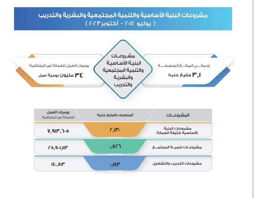 1- مشروعات البنية الأساسية كثيفة العمالة بقيمة 2.130 مليار جنيه وفرت 7.913.605 مليون يومية عمل.