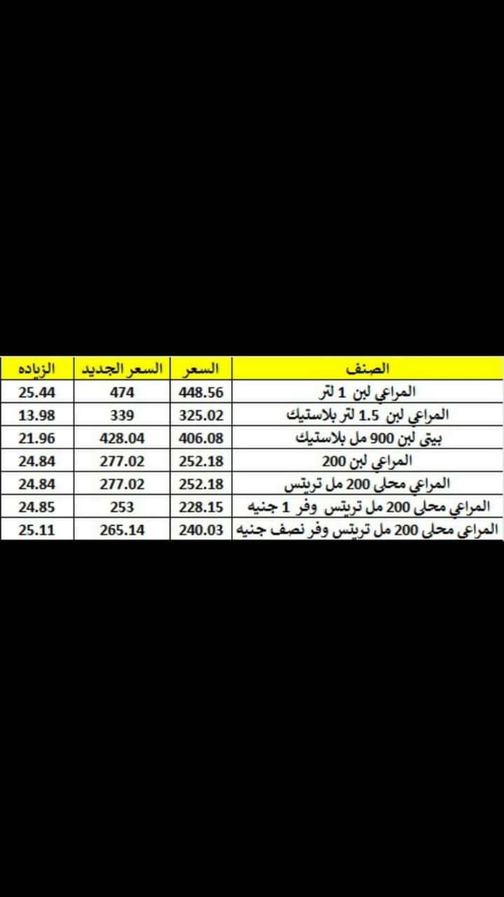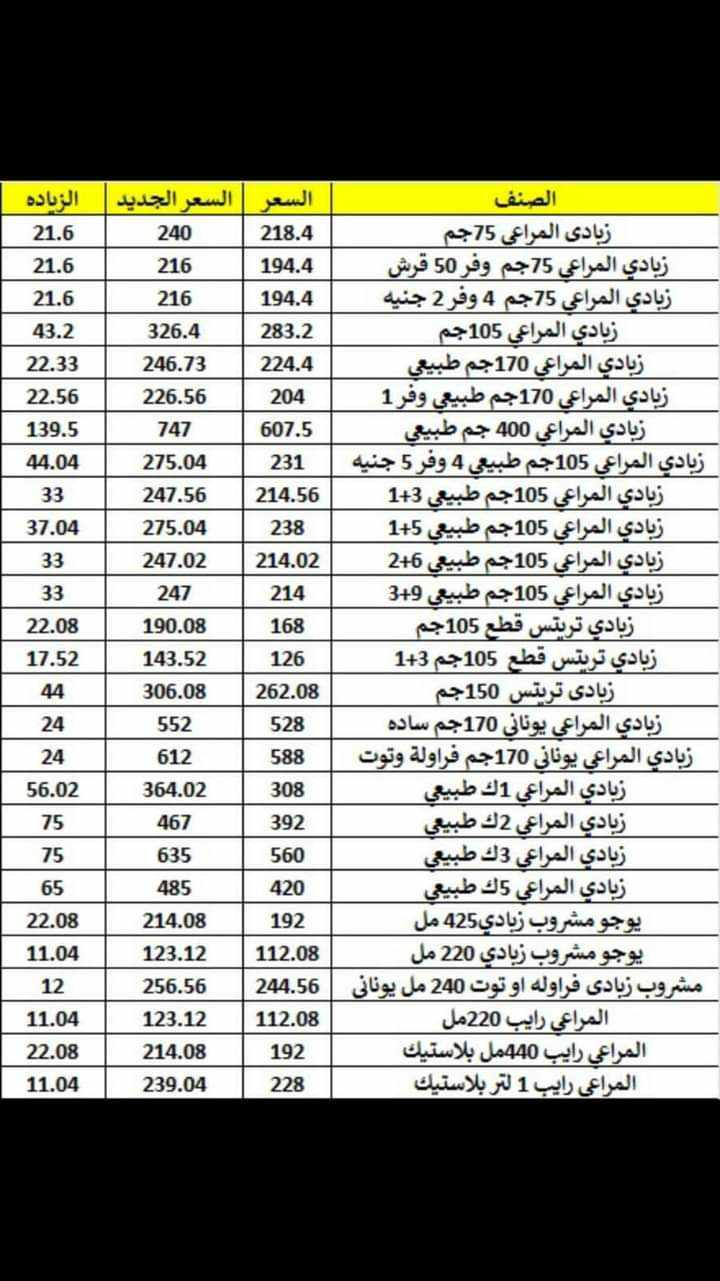 وعن قائمة أسعار منتجات الشركة الاستثمارية لمنتجات الألبان بعد تطبيق الزيادة في 2 ديسمبر الجاري، فجاءت كالتالي: