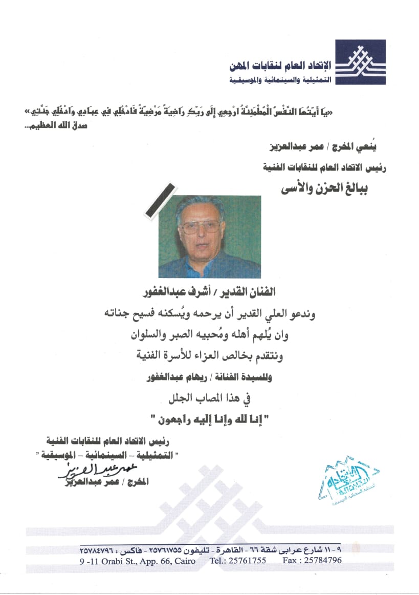 نعى اتحاد النقابات الفنية “التمثيلية والسينمائية والموسيقية” برئاسة المخرج عمر عبد العزيز الفنان القدير أشرف عبد الغفور، الذي وافته المنية مساء أمس الأحد عن عُمر ناهز الـ٨١ عاما..