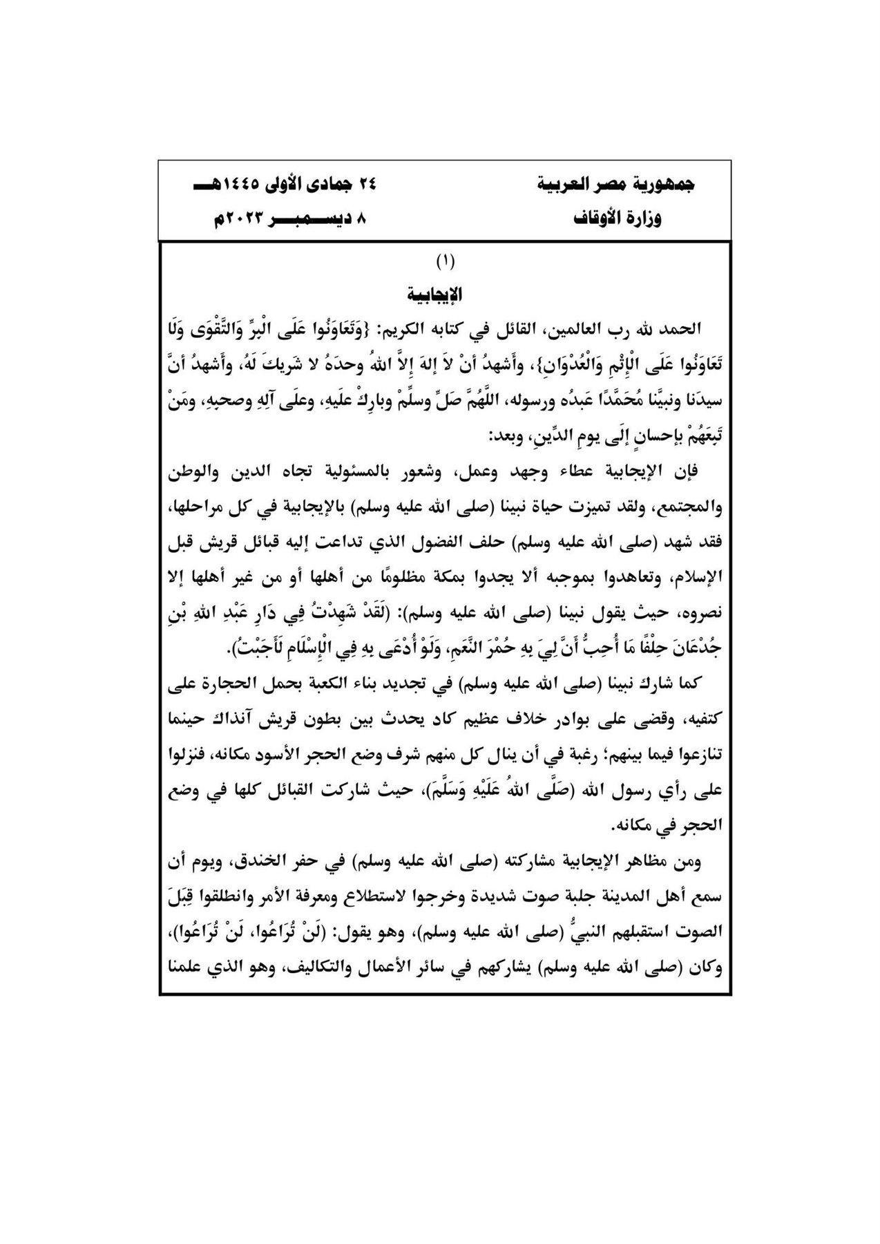عن “ الإيجابية”، الأوقاف تنشر نص خطبة الجمعة القادمة (صور)